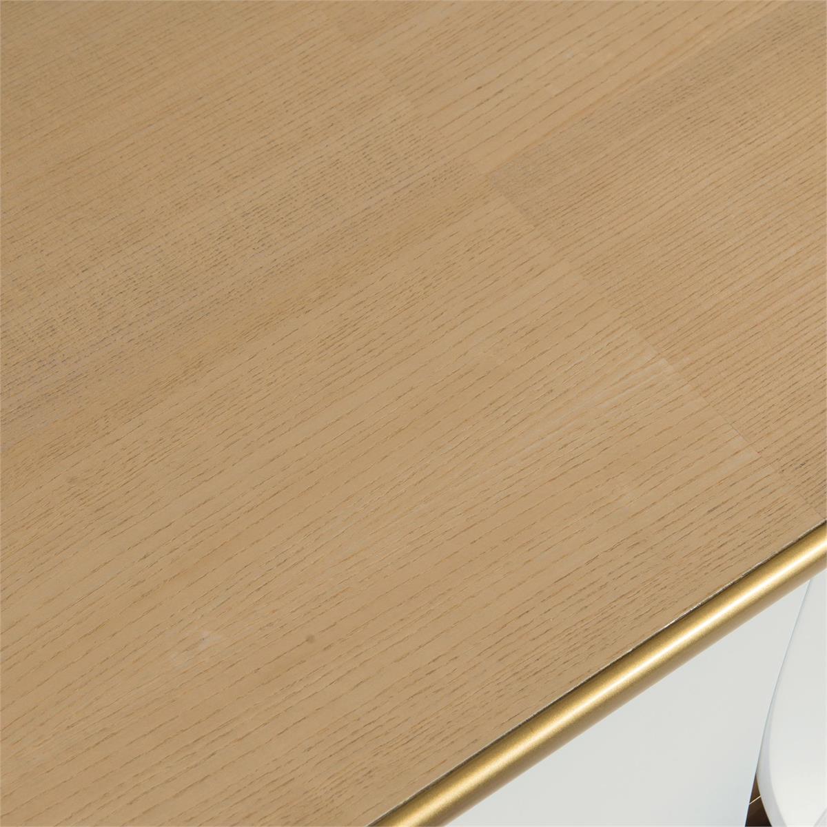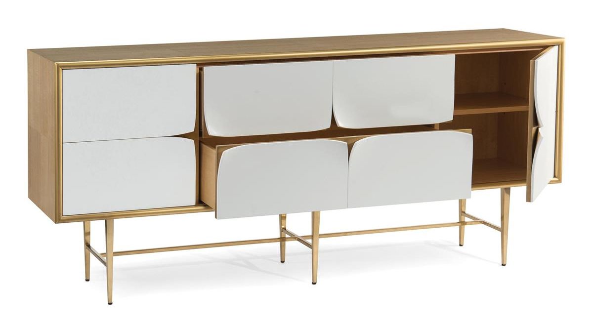 Product Description: John Richard EUR-04-0499 Pared Sideboard - A modern sideboard is in a natural ash veneer with a beluga front, framed in a bullnose molding of gold. The outer layer of the two doors and two drawer fronts peels away to form handles and reveal a gold finish behind. The cabinet sits on a stainless steel base in a polished brass finish.