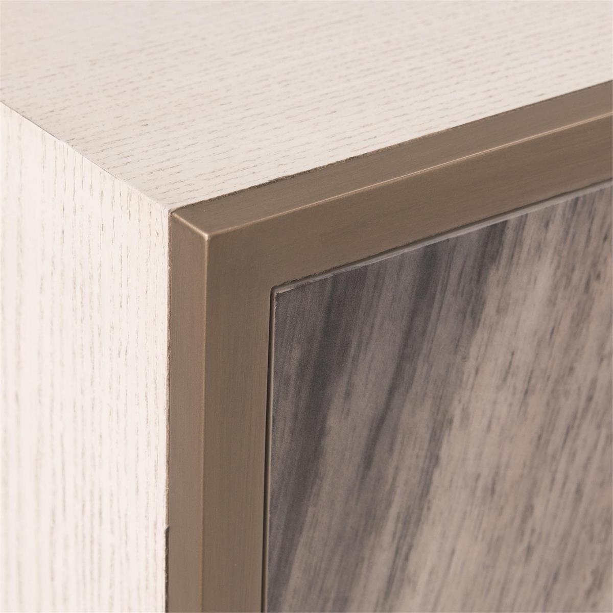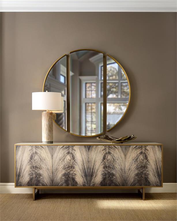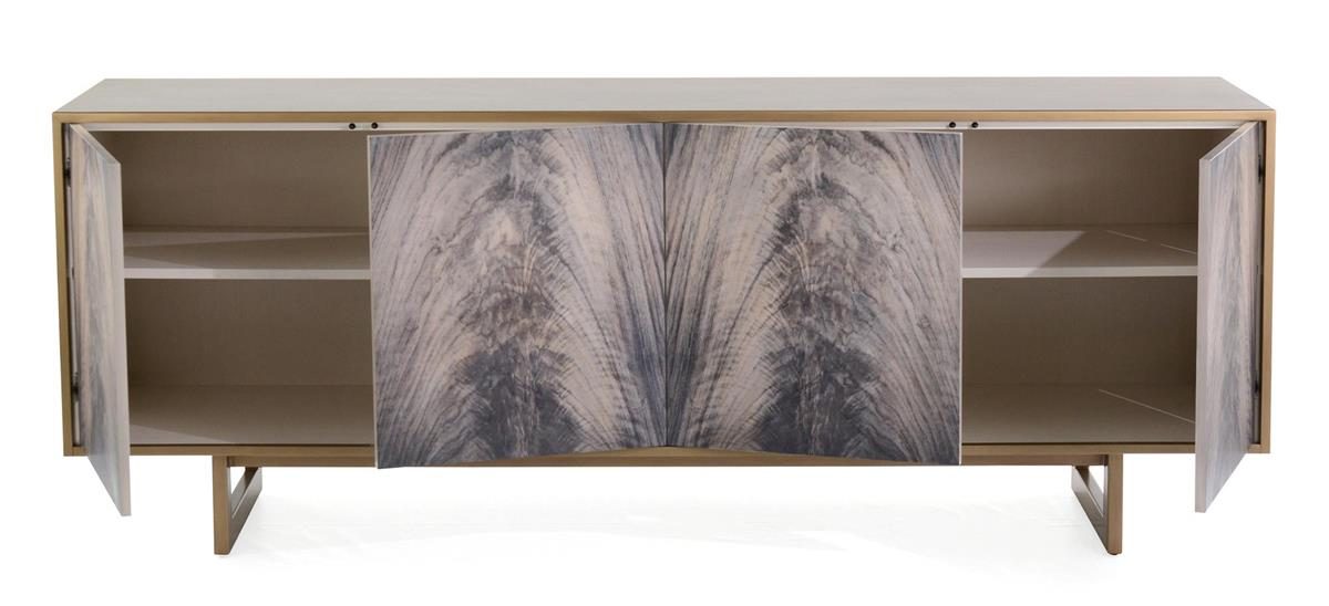 Product Description: John Richard EUR-04-0569 Deja Vu Credenza - Veneered in ash and finished in antique beluga, the front of this impressive credenza features individual prints of an exotic crotch veneer. Glazing is applied by hand before a final clear lacquer. The case is set on a steel base in a brushed brass finish, with a front molding to match.