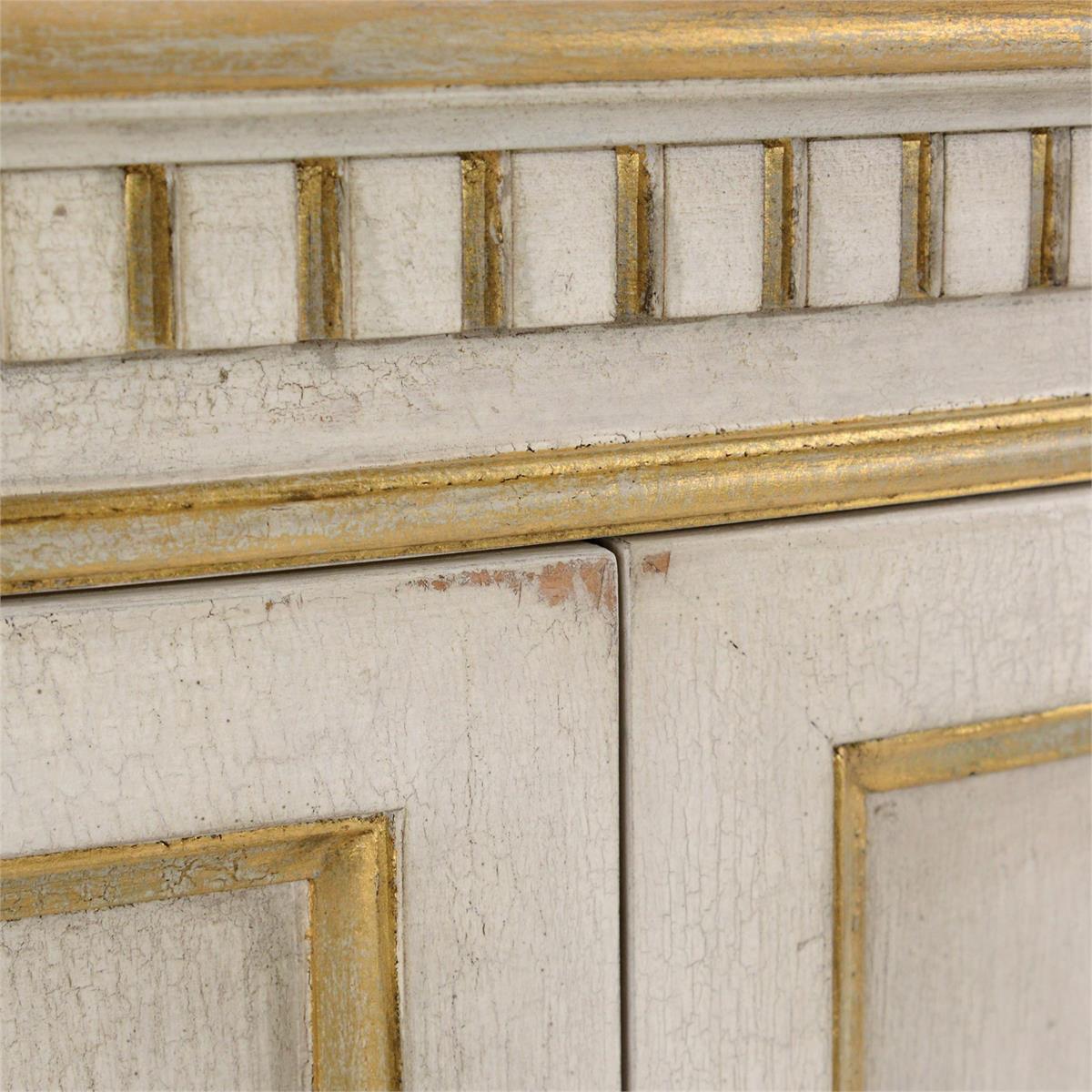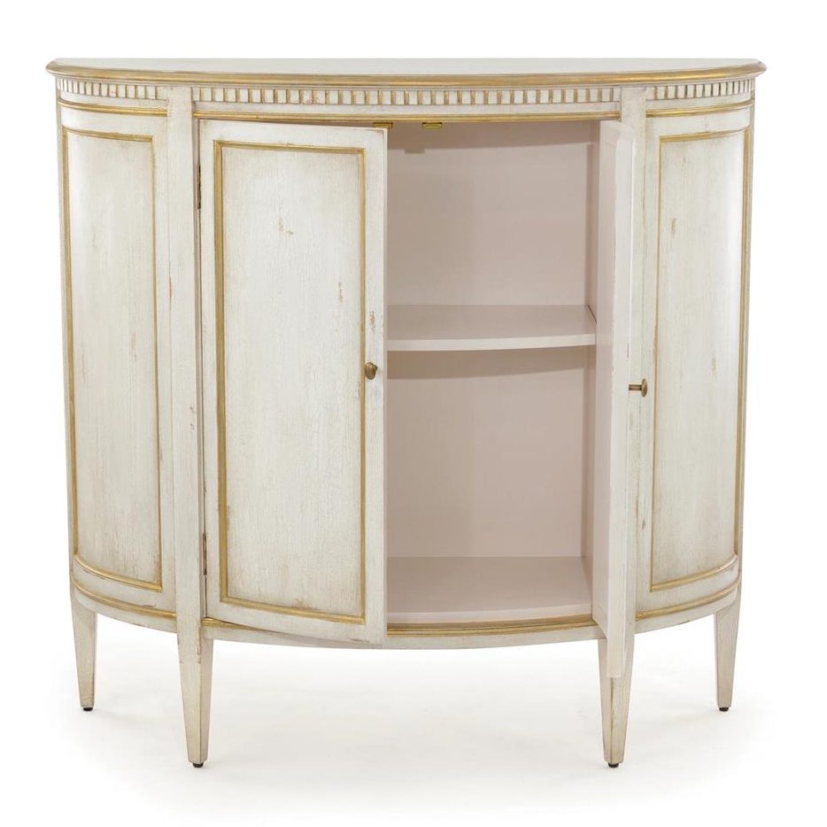 Product Description: John Richard EUR-04-0611 Volnay Demilune Cabinet - The Volnay is a demilune cabinet in the French country style set on gently tapering legs. The finish is in distressed cream with gold detailing and an antique crackle effect. The case features dental molding under the ogee top. There are two paneled doors, each with a single antique brass knob and brass hinges.