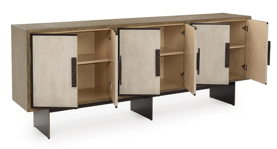 Product Description: John Richard EUR-04-0715 Kaya Credenza - Kaya Six-Door Credenza has white gesso burlap fronts with a beautifully textured natural crackle finish. This piece is wrapped on the outside in Driftwood Oak and is paired with bold textured sculptural bronze hardware. It sits atop a stainless steel base.