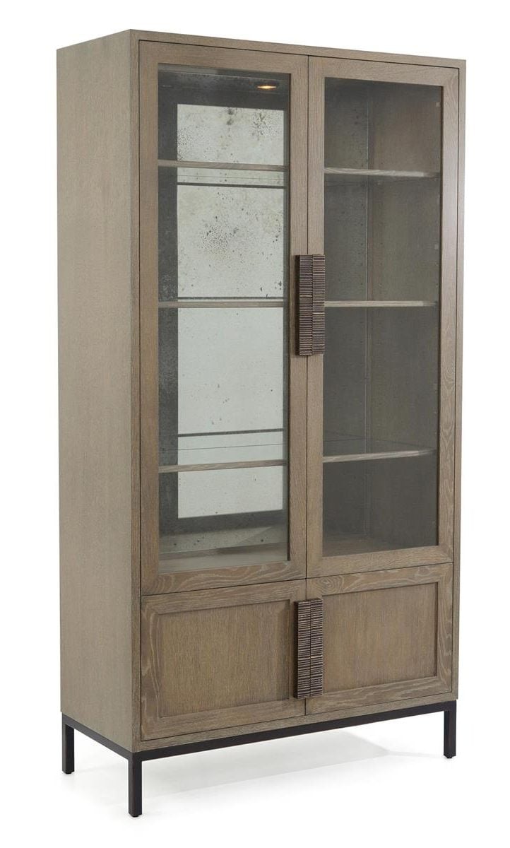 Product Description: John Richard EUR-04-0718 Parker Cabinet - This casual display cabinet is in oak in our Driftwood finish. The tempered glass doors feature beautiful bronze sculptural hardware. The interior features a mirrored back and touch-sensitive lights operated by an inset button on the right-hand side of the cabinet.