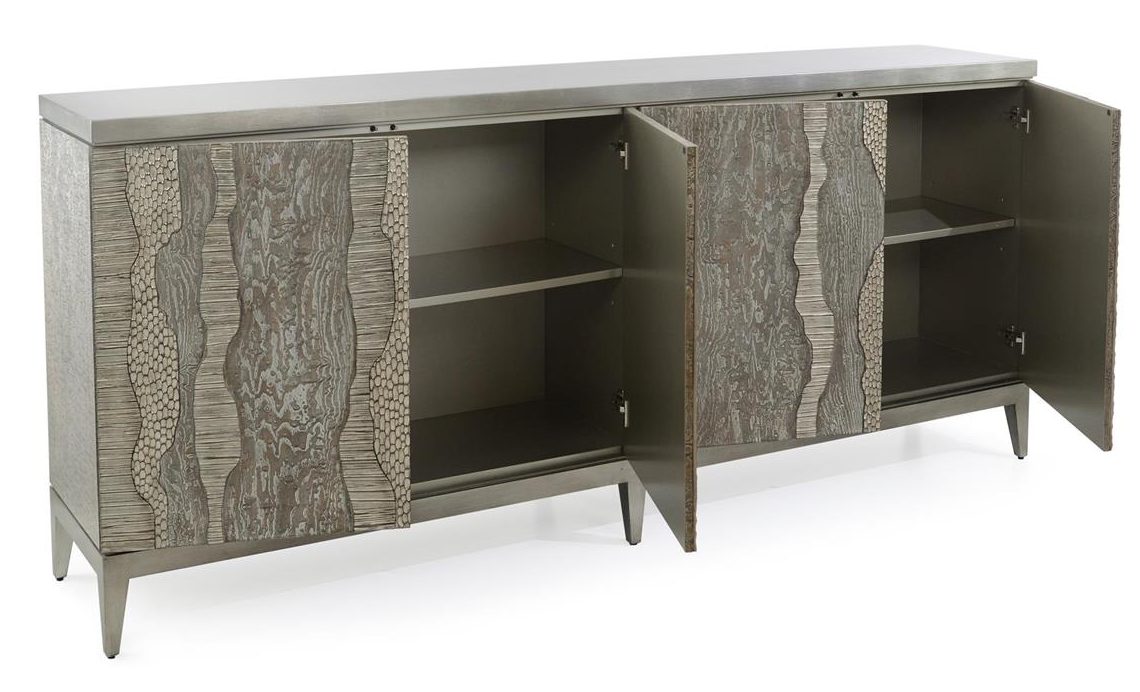 Product Description: John Richard EUR-04-0728 River's Edge Silver Credenza - This gorgeous sideboard features a silver cerused finish. The four door fronts showcase linear striations with multiple textures in a finish of silver to compliment the tamo ash wood.