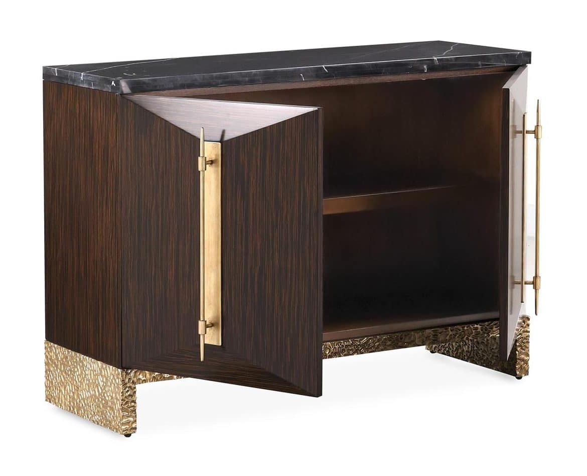 Product Description: John Richard EUR-04-0890 Alaric Two-Door Cabinet - The Alaric Two-Door Chest is crafted from quartered Macassa veneer in a Merida Ebony finish, its deep tone and fine grain emphasizing the cabinet’s bold geometry. The doors align seamlessly beneath a polished Nero Marquina marble top, adding a refined touch of contrast. Long aluminum handles in Valyrian Gold draw attention to the sculpted façade, complemented by a matching composite base featuring rich, dimensional textures. Inside, an Espresso-finished compartment with an adjustable shelf provides practical storage. This contemporary piece is affixed with adjustable glides for stability and ease of placement.