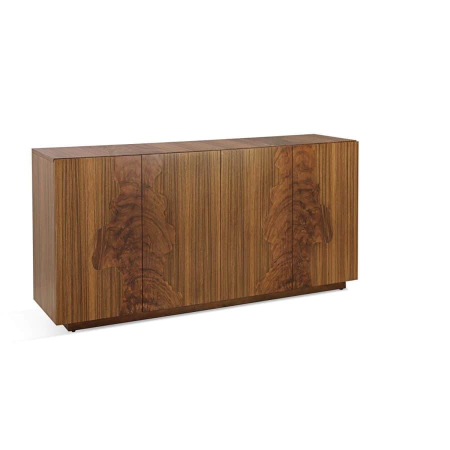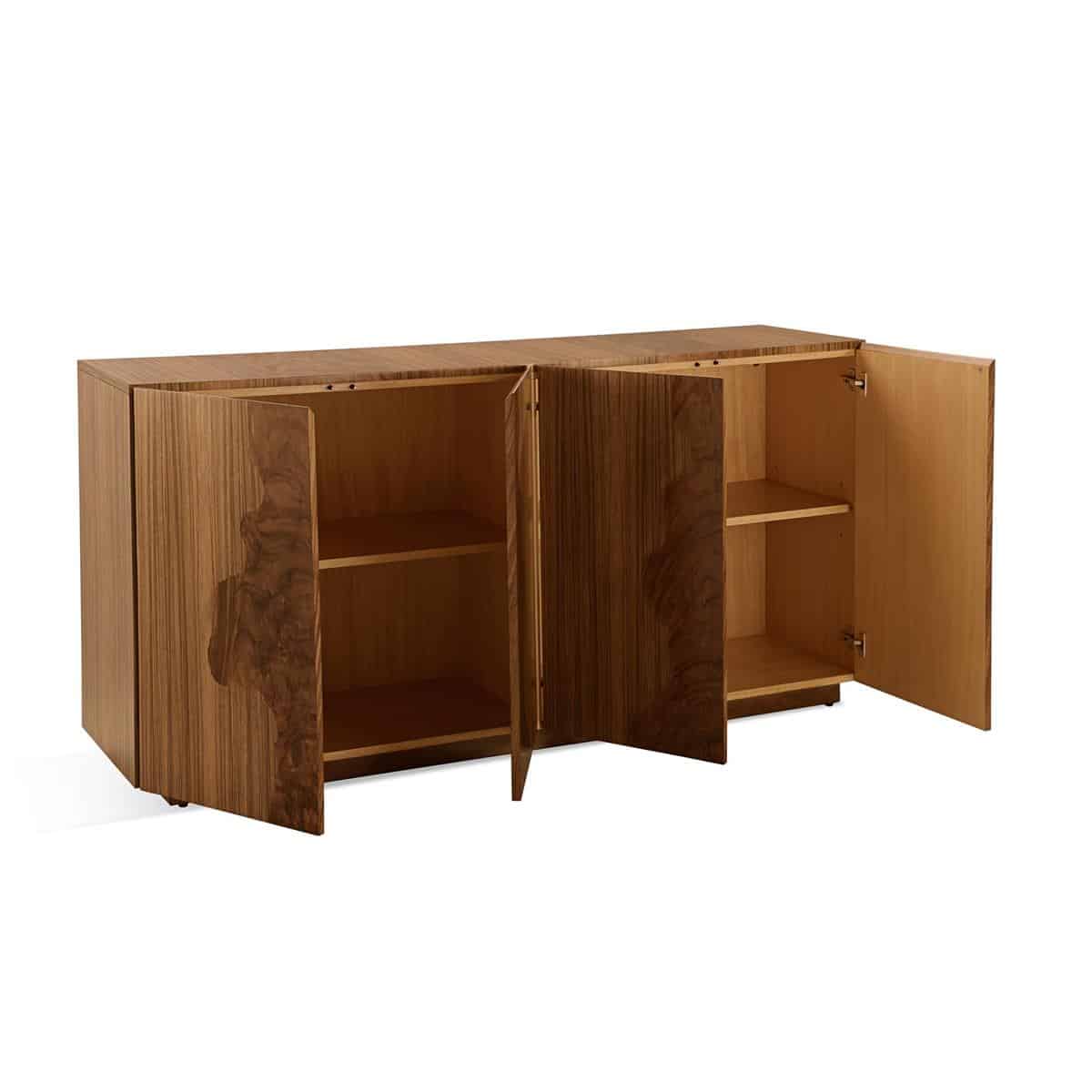 Product Description: John Richard EUR-04-0891 Wildwood Sideboard - The Wildwood Sideboard is a striking contemporary design that brings bold organic forms into any interior. Crafted from paldao and zebralli in a Natural finish, the piece showcases a beautiful two-toned display of contrasting wood grain across the surface of its four push-latch doors, creating a rich sense of visual depth. A matching plinth base grounds the design, while two interior compartments with adjustable shelves offer versatile storage. The back side of the sideboard features cable holes, allowing for easy cable management.
