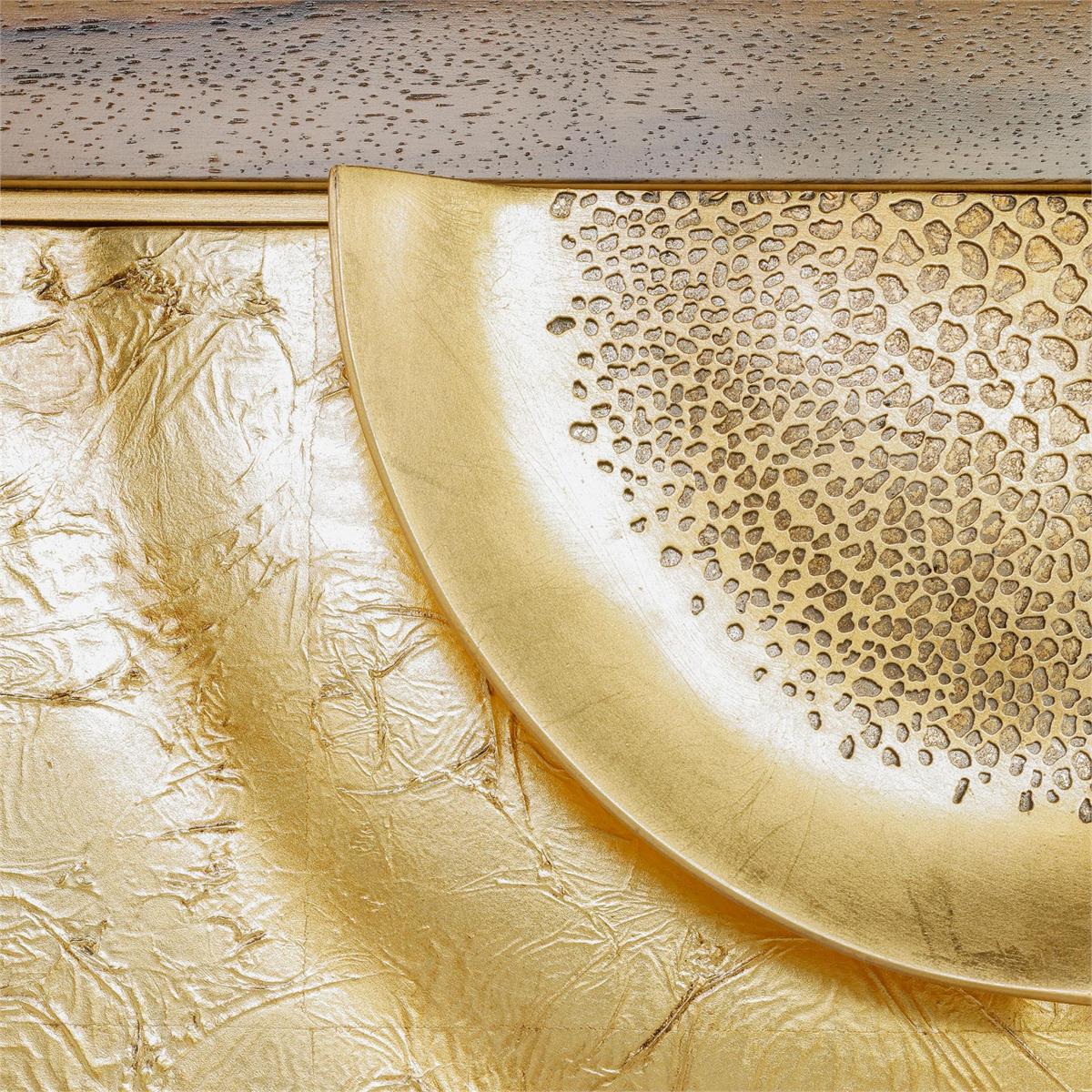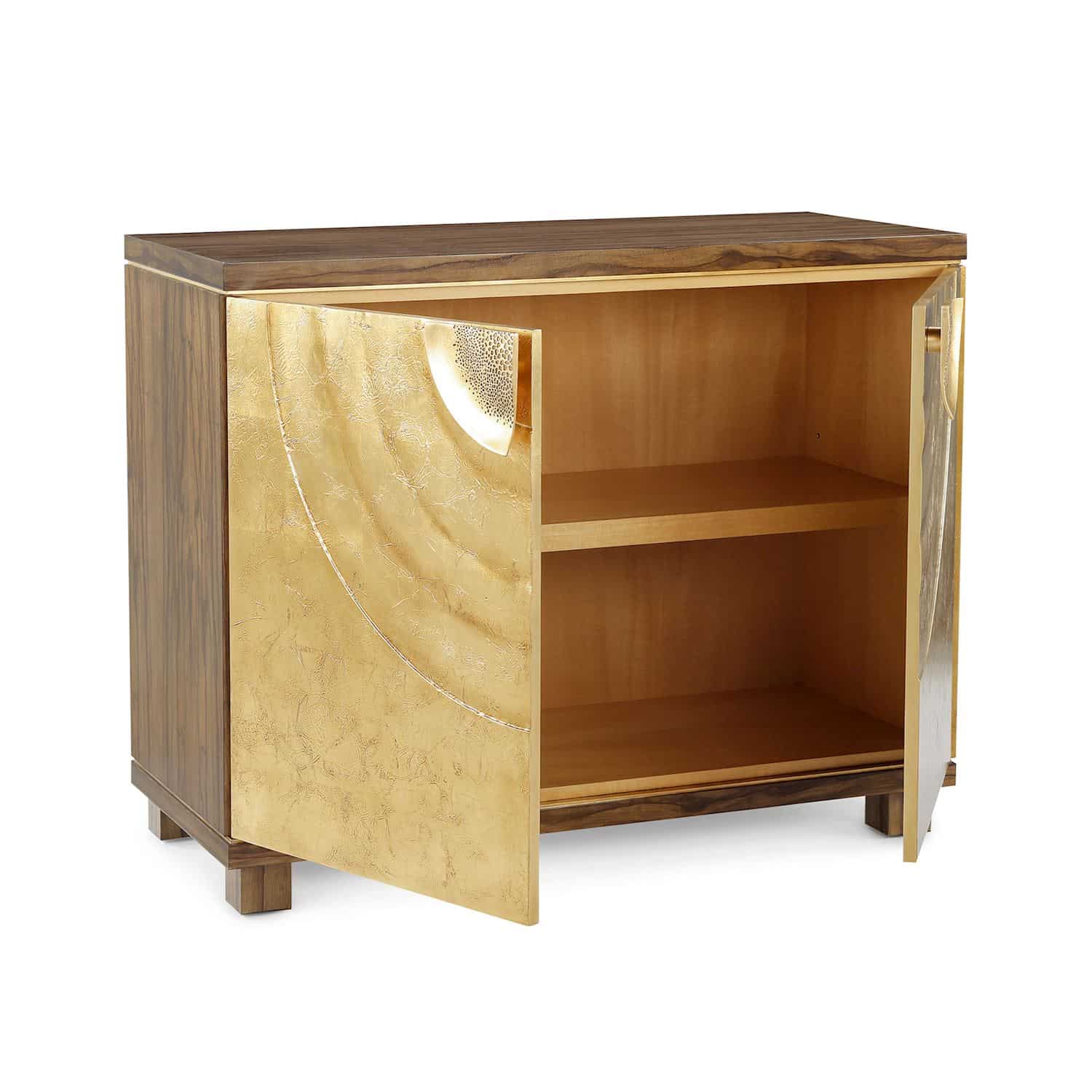 Product Description: John Richard EUR-04-0899 Gilded Arc Two-Door Cabinet - The Gilded Arc Two-Door Cabinet is a captivating statement piece with distinguished character. Crafted from ofram wood in a Natural Paldao finish, the case takes on a dark brown tone that beautifully contrasts two push-latch doors in Venetian Gold. The doors feature a dimensional surface, showcasing stylish arched forms that surround stainless-steel handles with organic details. The piece features a single interior compartment with one adjustable shelf.