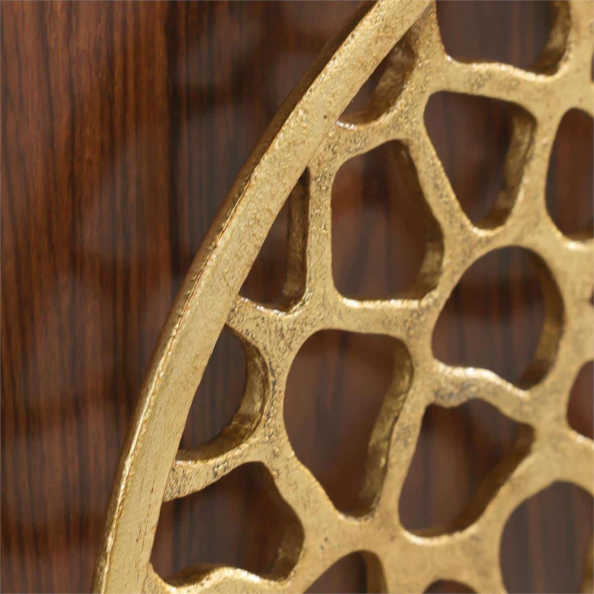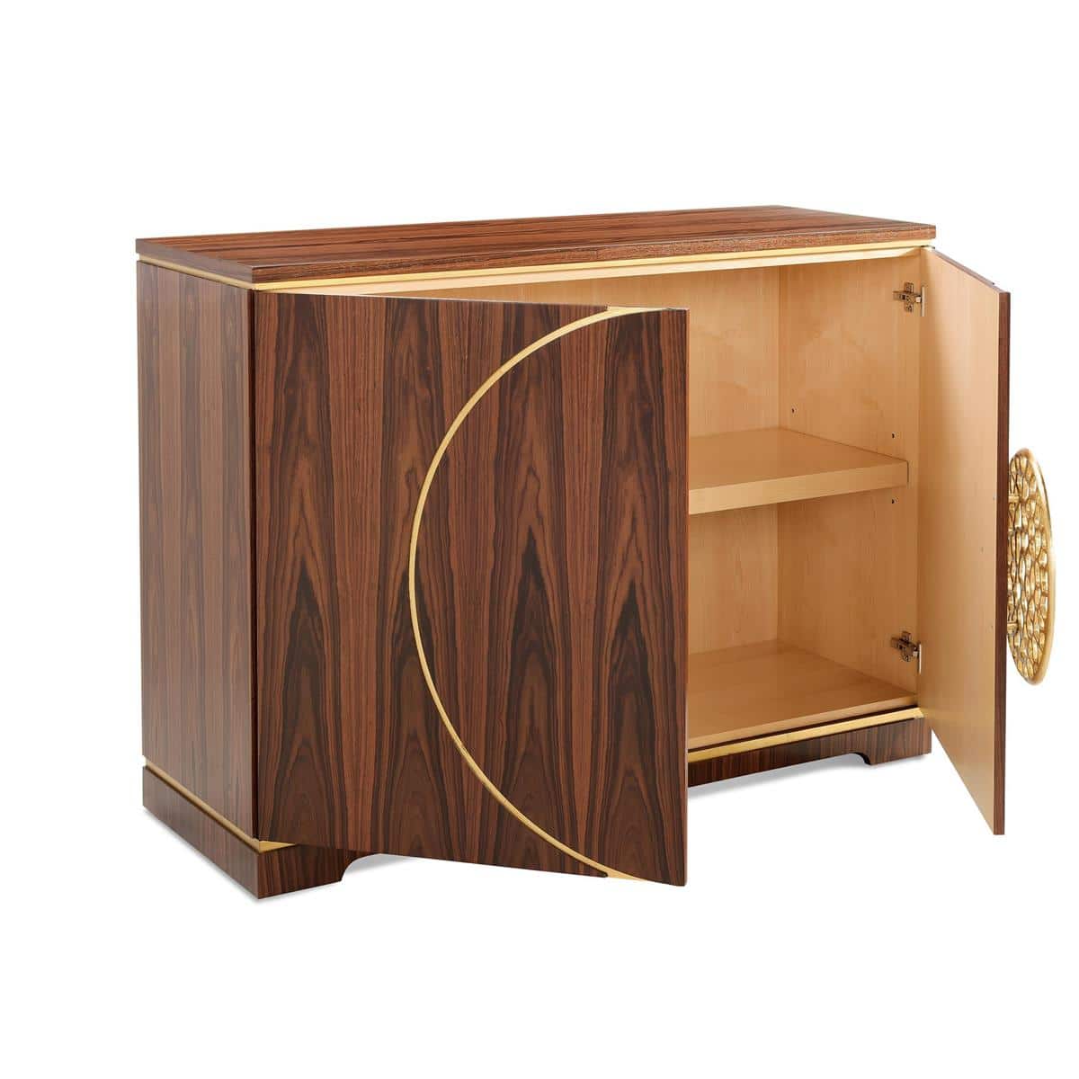 Product Description: John Richard EUR-04-0908 Loreto Two-Door Cabinet - The Loreto Two-Door Cabinet effortlessly blends rustic forms and ornate tones. The piece is crafted from morado wood in a Natural Morado finish, boldly highlighting the natural grain patterns. Tones of Exotic Gold accent the sculptural molding and frames two aluminum handles with intricate, organic detailing. This cabinet features a cable cutout and a single interior compartment with an adjustable shelf.
