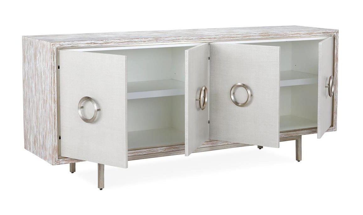Product Description: John Richard EUR-04-0913 Annelise Four-Door Sideboard - The Annelise Four-Door Sideboard is crafted from maple veneer in a Danish White finish, giving the piece a clean, structured presence. The doors are wrapped in linen finished in Burnished Pewter, introducing a soft metallic texture that catches the light with subtle variation. A stylish steel base showcases an Armada Silver finish, echoed by the circular handles that provide an elegant contrast to the design’s angular profile. The interior in a Beluga finish features two compartments, each with an adjustable shelf.