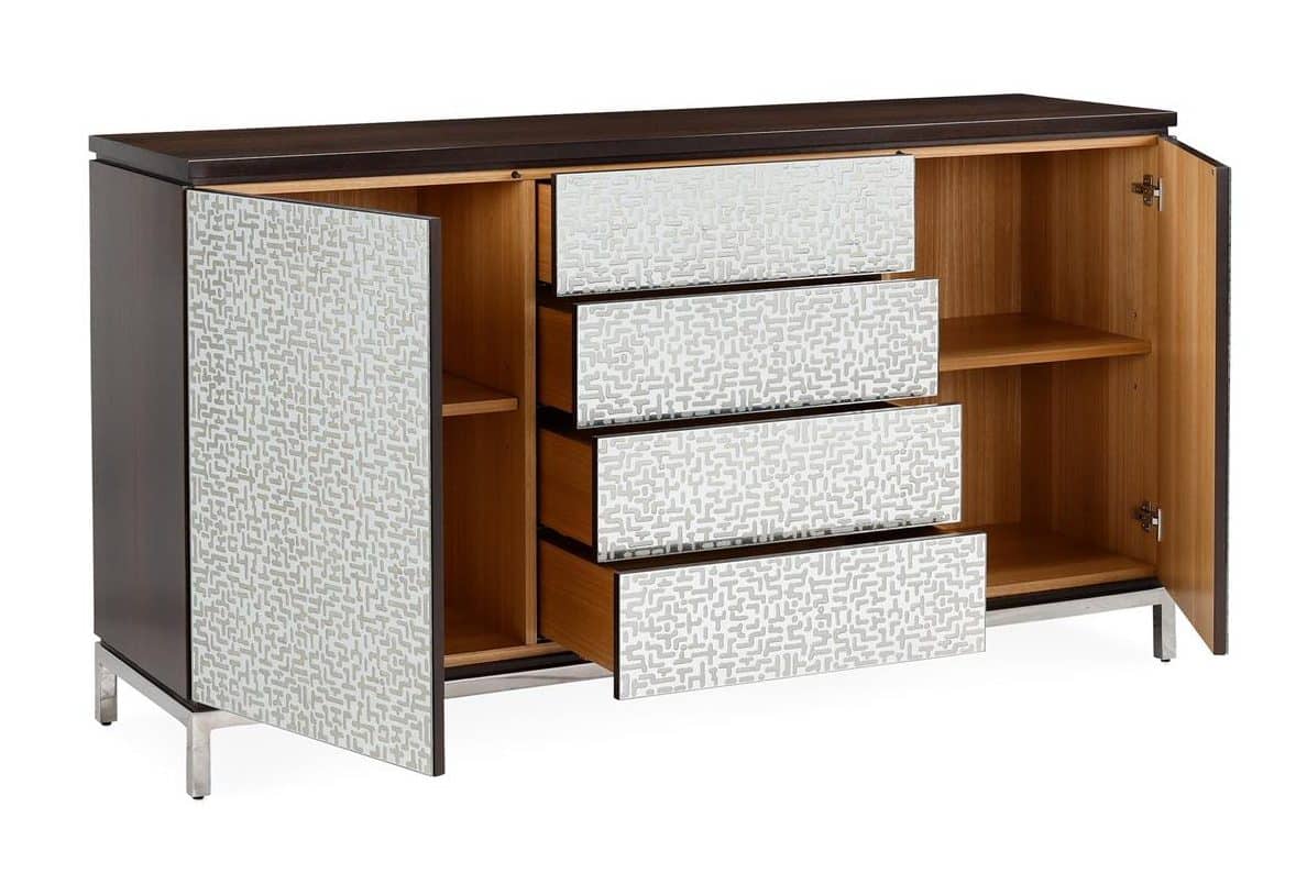 Product Description: John Richard EUR-04-0915 Loomis Sideboard - The Loomis Sideboard is crafted from eucalyptus veneer in a Light Smoked Eucalyptus finish, its natural grain framing the richly detailed facade. Glass panels across the front side are clad in an Inca Etch finish, showcasing irregular abstract shapes that form a gorgeous, mosaic-like surface. A polished stainless steel base provides a sleek foundation that mirrors the reflective quality of the glass. Inside, two compartments each include an adjustable shelf, flanking four center drawers for versatile storage.