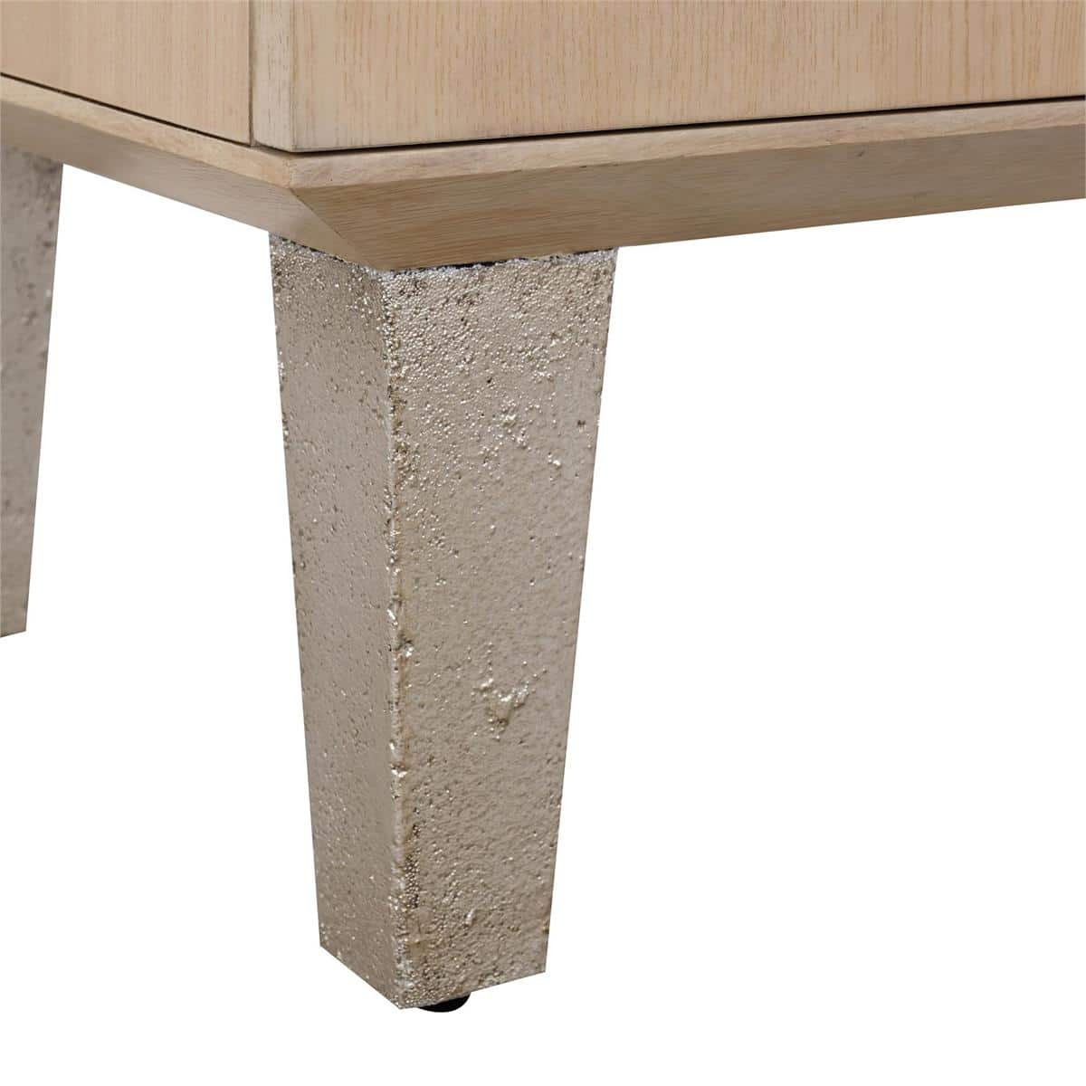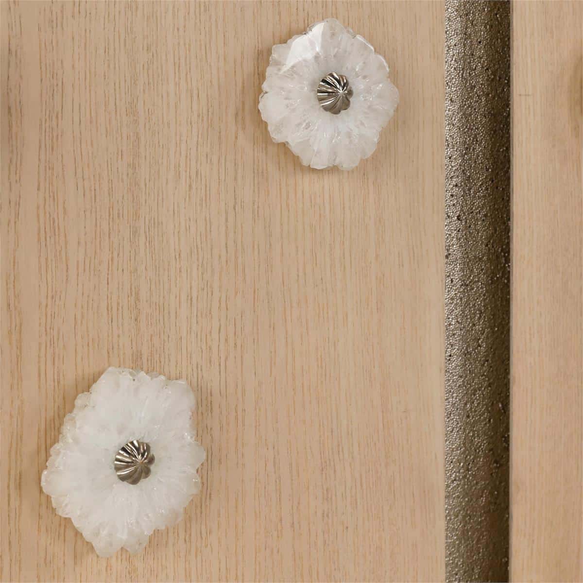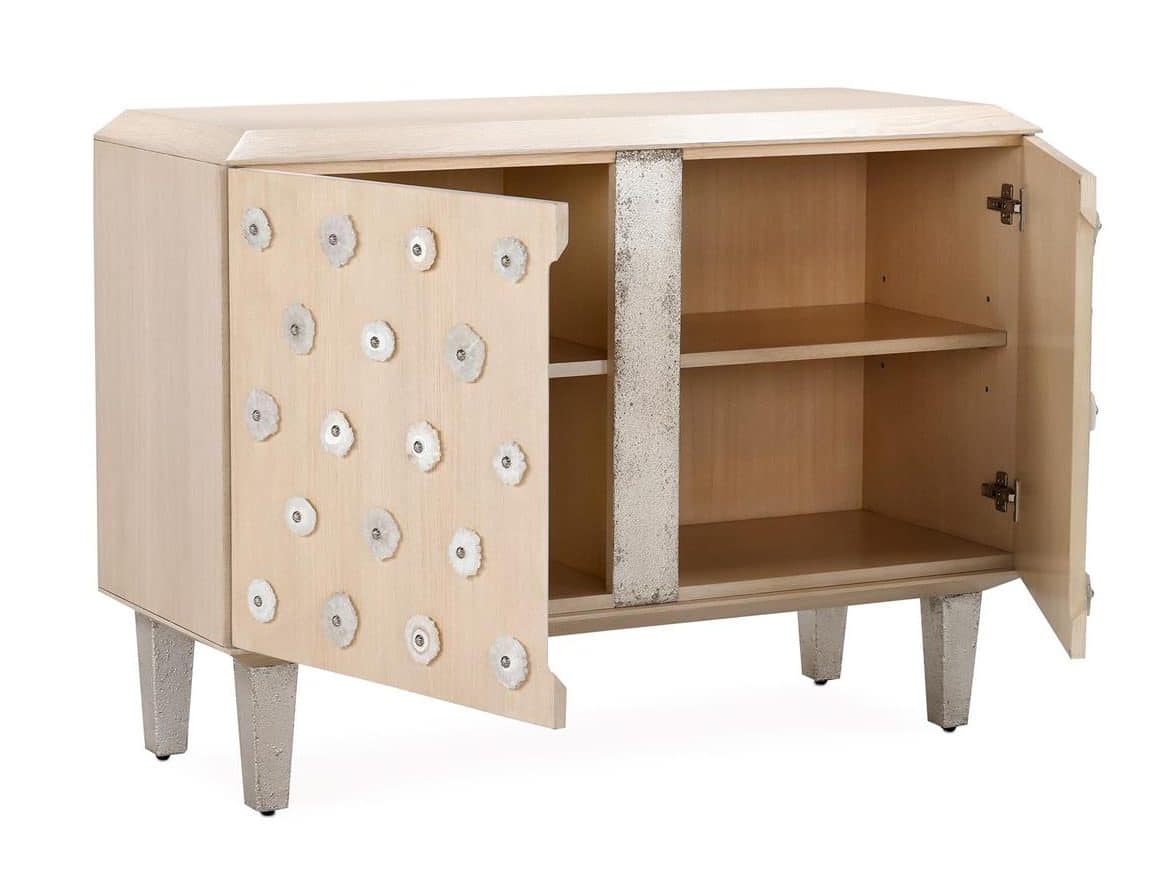Product Description: John Richard EUR-04-0928 Caicos Two-Door Cabinet - The Caicos Two-Door Cabinet is crafted from White Ash veneer in a Sun Bleached Ash finish, giving the piece a soft, natural tone with subtle grain movement. The doors are embellished with crystal accents, each centered with starburst nailhead trim that catches the light in elegant, radiant detail. Finished in Truro Silver, the tapered legs and center divider introduce a refined metallic contrast to the pale wood tones. This gorgeous design features two interior compartments, each with an adjustable shelf, as well as adjustable glides.