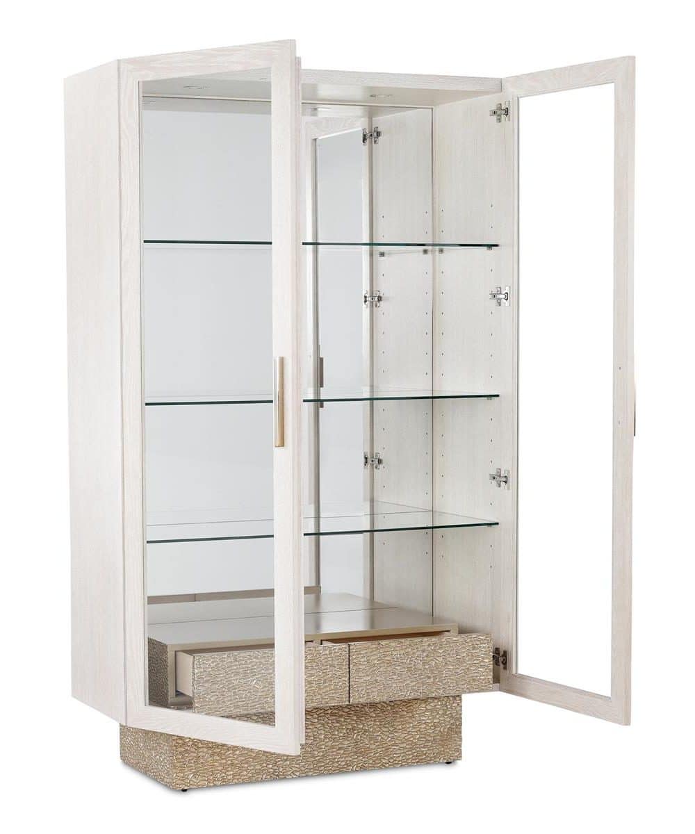 Product Description: John Richard EUR-04-0929 Alistair Display Cabinet - The Alistair Display Cabinet is crafted from oak veneer in a Grey Washed Oak finish, giving the case a soft, neutral tone that highlights its clean silhouette. The mirrored back and tempered glass shelves create an open, reflective display space softly illuminated by interior puck lights. Polished stainless steel handles in a White Brass finish complement the base and drawer, which feature textural composite detailing in Valyrian Gold.