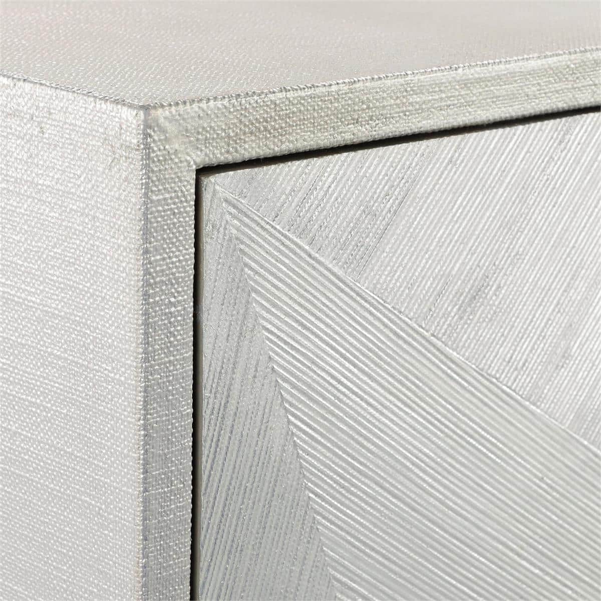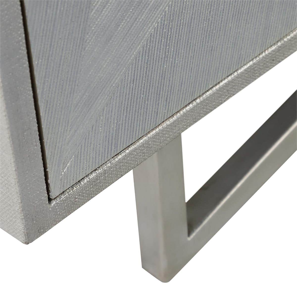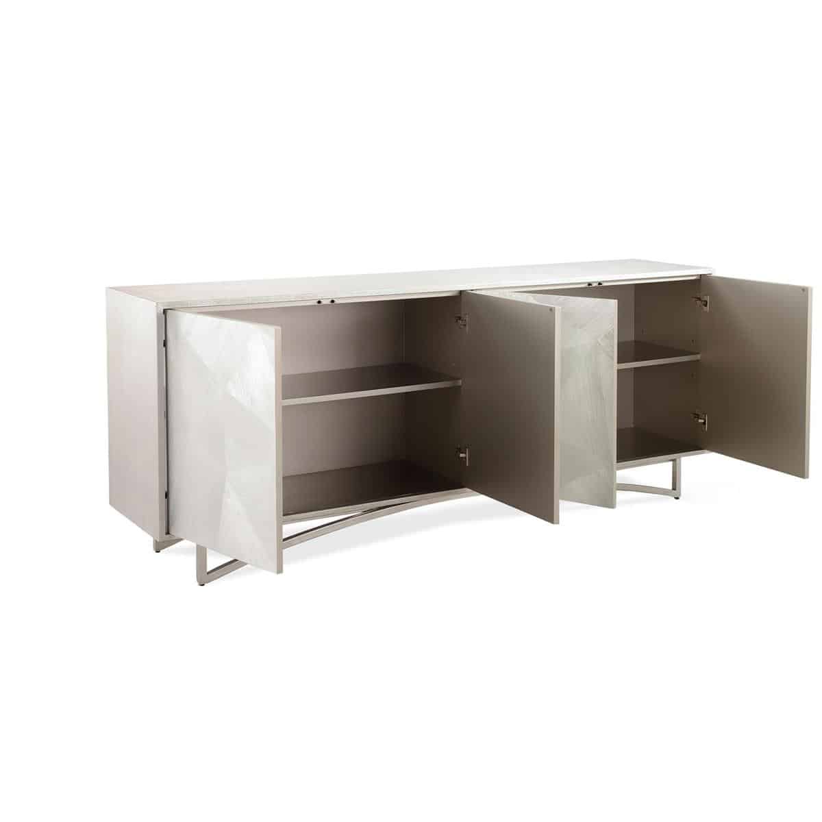 Product Description: John Richard EUR-04-0935 Vertex Four-Door Sideboard Silver - The Vertex Sideboard presents a stunning mosaic of abstract geometry. Showcasing a sleek, contemporary profile, the piece is wrapped in linen in a Silver White Wash finish that beautifully complements two arched steel legs. Four push-latch doors feature flowing shapes with dimensional texturing in a Pewter finish, creating the illusion of a faceted surface. This sideboard features two interior compartments finished in Silver Powder, each with a single adjustable shelf.