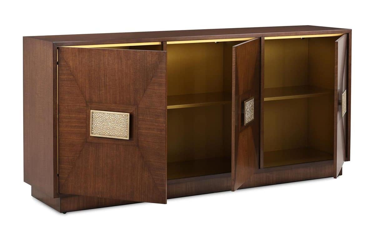 Product Description: John Richard EUR-04-0947 Everett Three-Door Sideboard - The Everett Three-Door Sideboard is crafted from American Black Walnut in a Mid Century Walnut finish, highlighting the veneer’s rich tone and precise craftsmanship. The doors feature a striking geometric pattern, the angled veneer cuts forming a faceted design that accentuates the wood’s natural depth. Each aluminum handle in a Valyrian Gold finish presents a textural center framed by polished edges, offering a refined metallic contrast against the walnut surface. Inside, three compartments feature a Gold Powder finish, each with an adjustable shelf for flexible storage within this elegantly structured design.