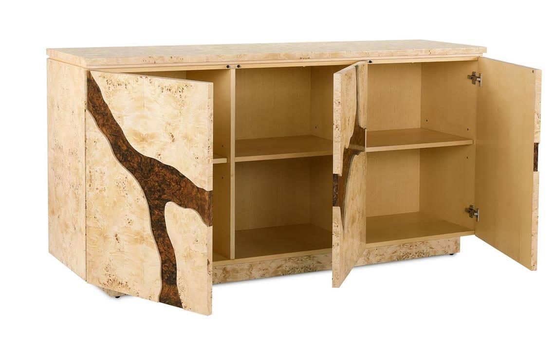 Product Description: John Richard EUR-04-0949 Orin Three-Door Credenza - The Orin Three-Door Credenza is crafted from mappa burl veneer in a Canvas finish, its light surface alive with swirling patterns and organic character. Sweeping inlays of walnut burl in a Medium Walnut finish create a striking contrast, their darker lines flowing organically across the surface in branching currents. This piece features three interior compartments, each with an adjustable shelf, as well as adjustable glides for ease of placement.