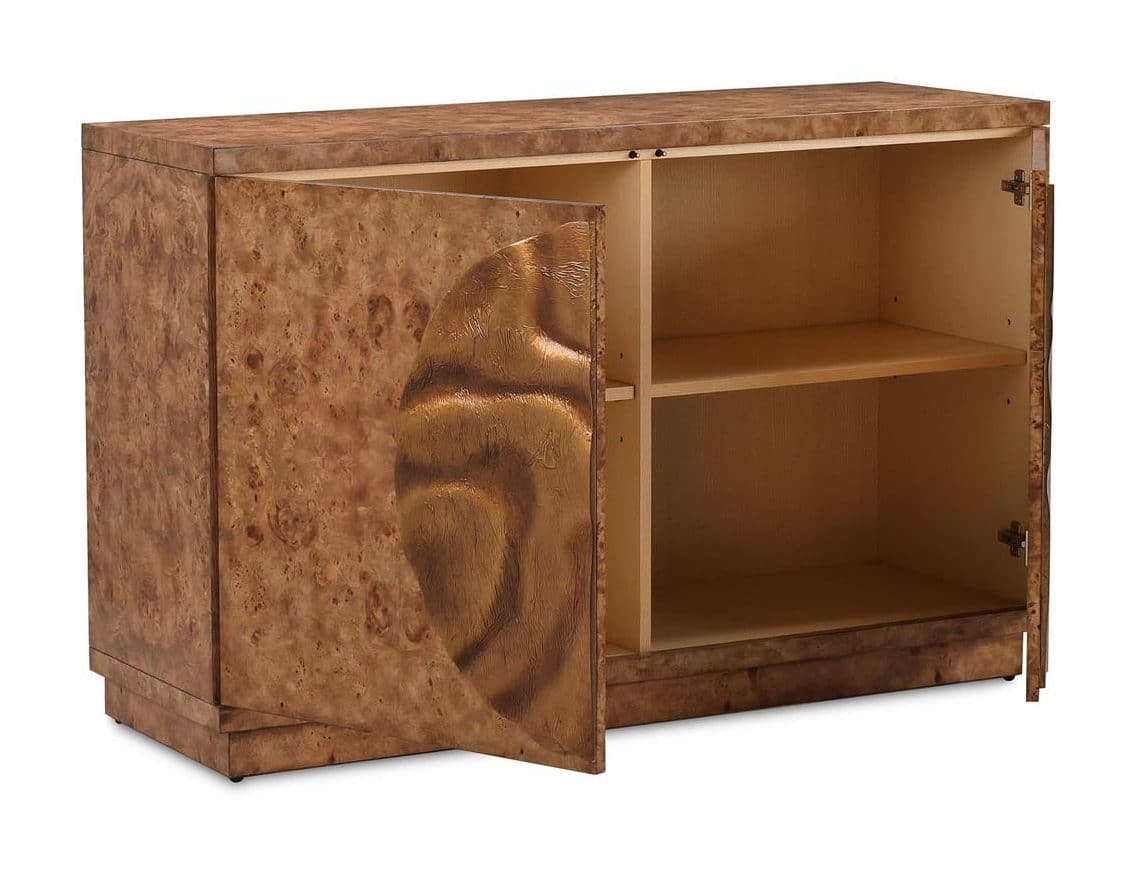 Product Description: John Richard EUR-04-0956 Rhine Two-Door Cabinet - The Rhine Two-Door Cabinet is crafted from mappa burl veneer in a Fruitwood finish, its surface alive with intricate grain patterns and warm tonal variation. The doors are distinguished by bold, sculptural handles in a Bronzed Gold finish, their flowing organic forms introducing depth and artistry to any setting. The interior of white ash veneer in a Natural finish features two compartments, each with an adjustable shelf, as well as adjustable glides for ease of placement.