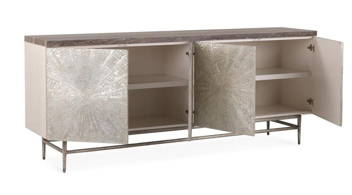 Product Description: John Richard EUR-04-0976 Conway Four-Door Sideboard - The Conway Four-Door Sideboard is crafted from white ash veneer in an Antique Beluga finish, crowned with a striking silver travertine marble top that displays stunning natural vein patterns. The doors showcase intricate composite detailing that radiates outward in a delicate sunburst motif, brought to life by a Silvered Chalk finish that accentuates the pattern’s dimensional texture. A matching cast aluminum base grounds the piece with a subtle metallic sheen, lending balance to its luminous facade. The interior, finished in Ivory, features two compartments each with an adjustable shelf. Adjustable glides are included to ensure effortless placement.