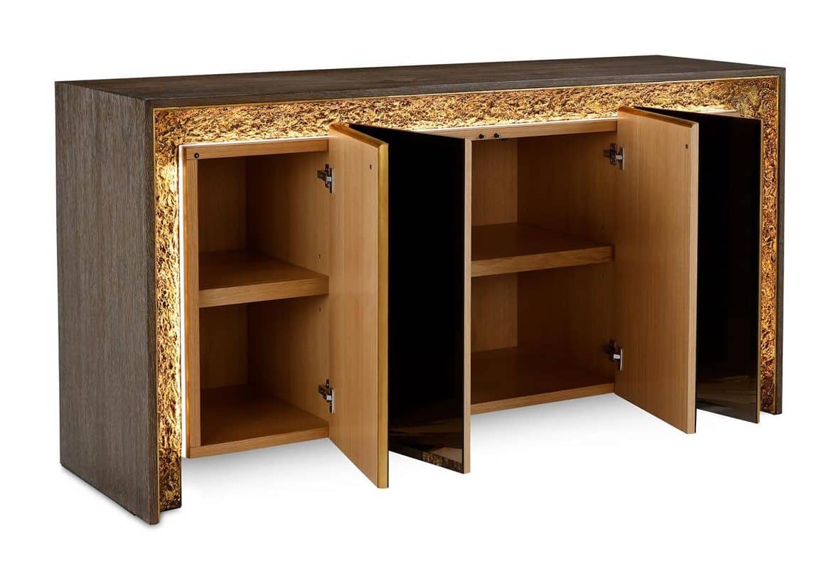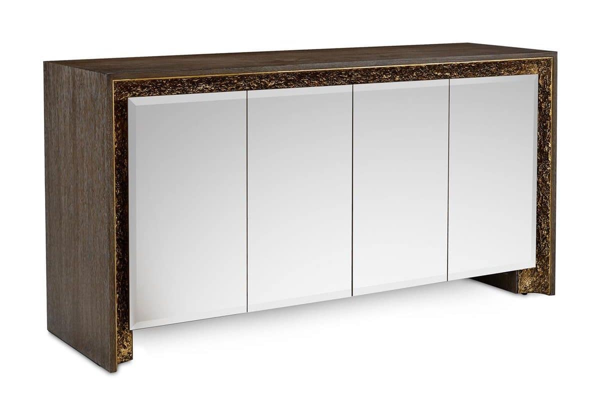 Product Description: John Richard EUR-04-0979 Coloma Four-Door Lighted Credenza - The Coloma Four-Door Lighted Credenza is crafted from oak veneer in a Falstaff finish, its clean, linear form establishing a strong architectural foundation. Four beveled bronze-mirrored doors introduce a lustrous contrast, their reflective surfaces lending the piece a quiet sense of depth. Surrounding the doors, intricate Nugget Gold detailing traces the frame with texturally rich organic patterns. Inside, a Natural Oak finish reveals three compartments illuminated with LED strip lights, each with an adjustable shelf. Adjustable glides provide effortless placement.
