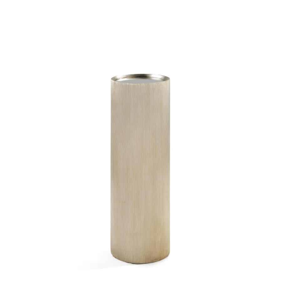 Product Description: John Richard EUR-08-0162 Bullion Pedestal Small - The Bullion Pedestal is a sophisticated home accent that balances rich texture with a sleek, elegant presence. Crafted from composite and cement, the piece features an alluring round profile in Valyrian Gold with a silver ombre effect, showcasing a coin-edge motif with textural ridges. A recessed beveled mirror tabletop completes the design, adding a final touch of understated elegance.