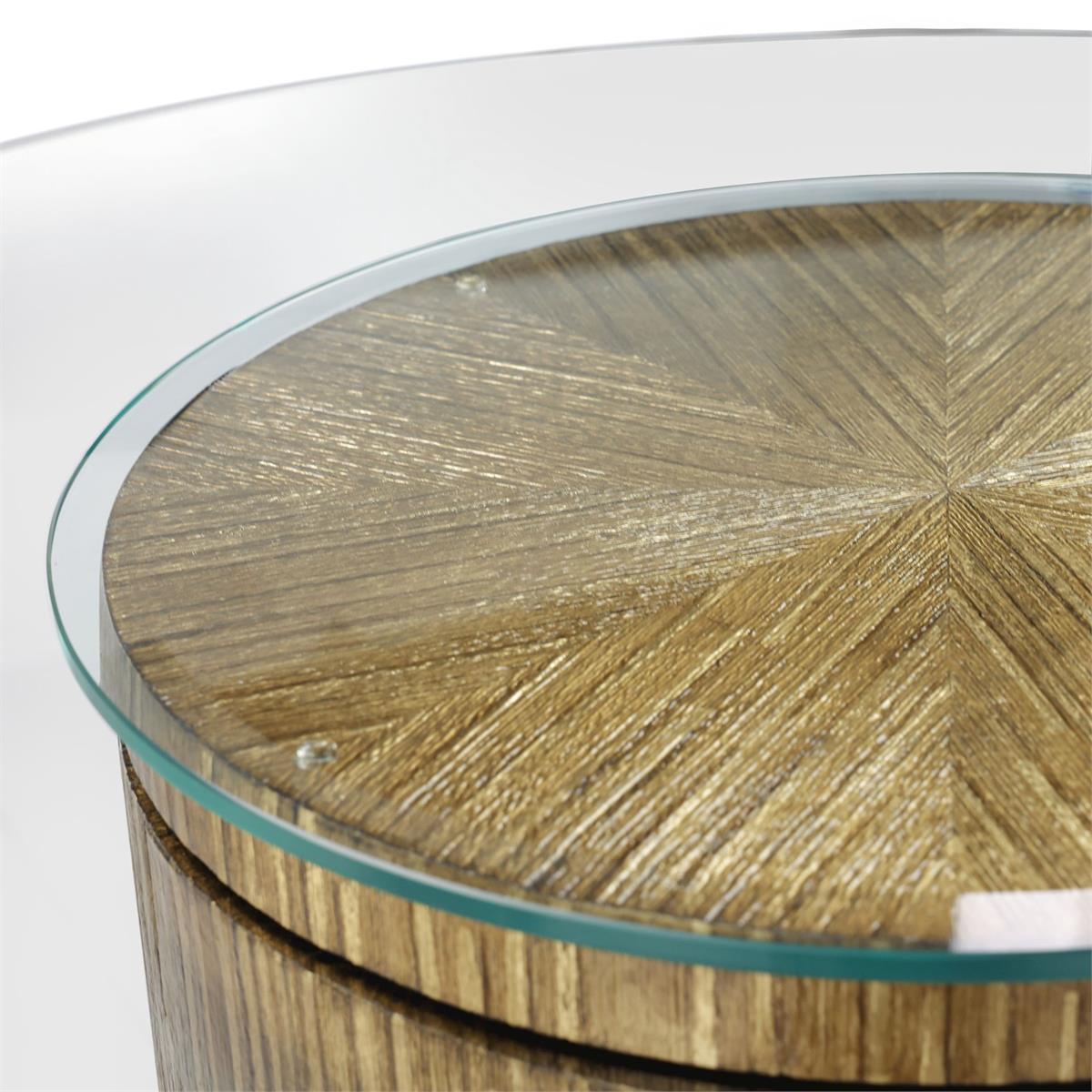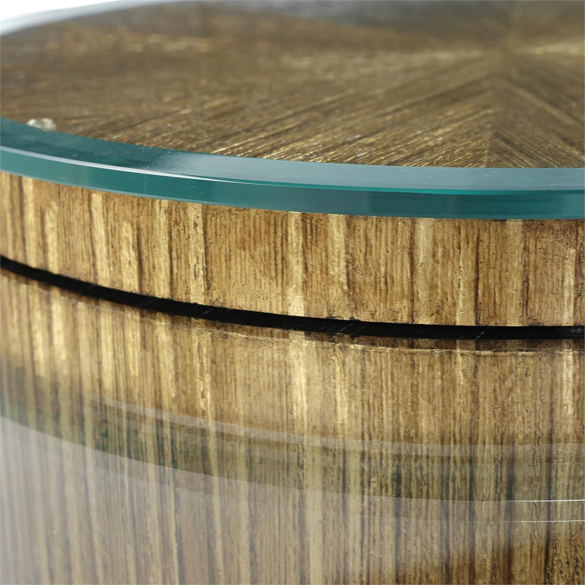 Product Description: John Richard EUR-10-0132 Stria Dining Table - The Stria Dining Table is a stunning contemporary piece that instills an interior space with rich texture and ornate tones. A rounded wood base is adorned in a distressed Linea Oro finish, enriching the piece with a gorgeous golden hue accented with textural lines. A rounded pane of beveled, tempered glass serves as the tabletop, matched by a removable lazy susan.
