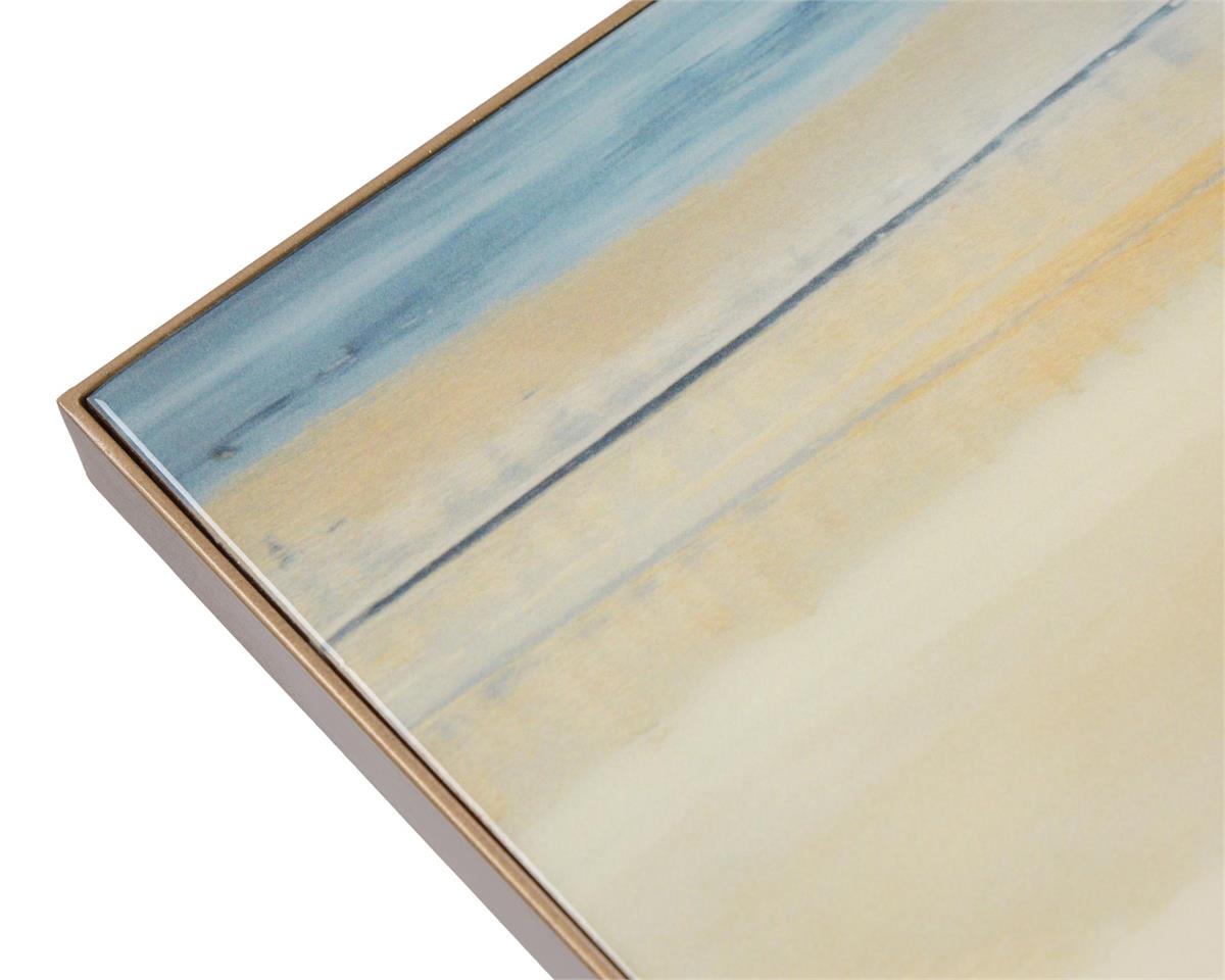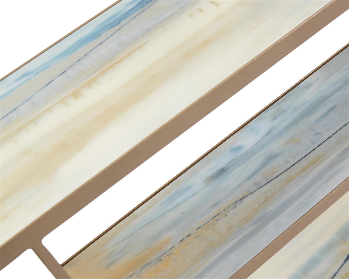 Product Description: John Richard JFD-0208 Austin A. James Concord Three-Tier Sofa Table - The Concord image by artist Austin A. James has been applied to the top and bottom tiers of this sofa table and covered in a hand-applied vitreous finish. The frame and legs are in a hand-finished gold.