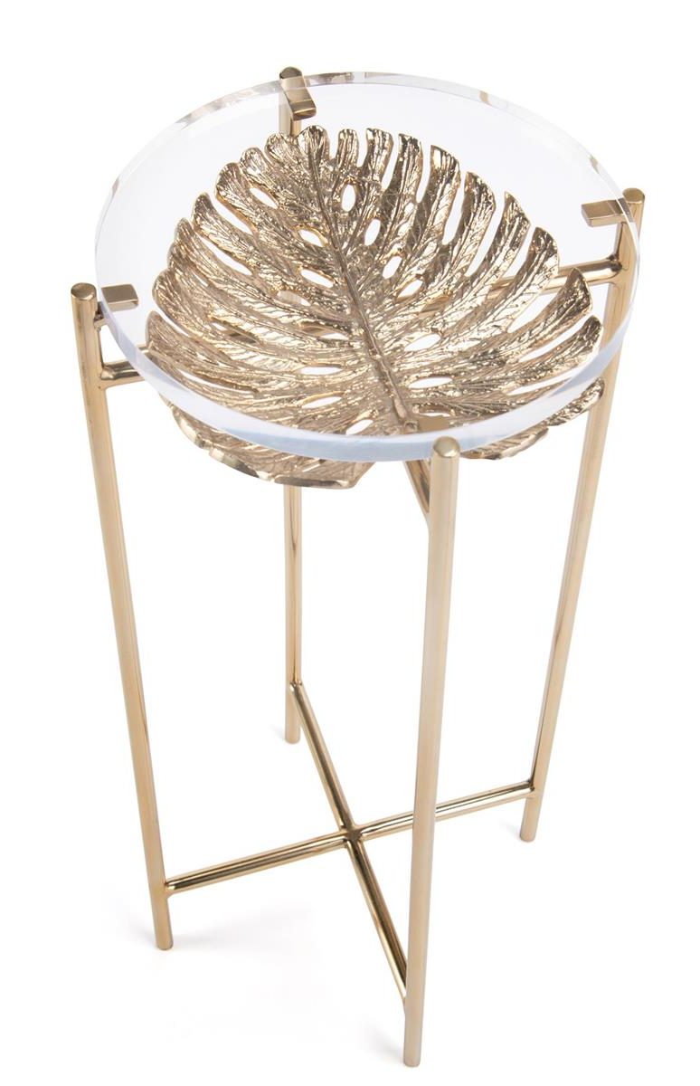 Product Description: John Richard JFD-0357 Palm Accent Table - The Palm Accent Table features a minimalistic base of stainless steel in a brass finish. The base supports a rounded surface of acrylic, with an intricately detailed palm leaf suspended underneath the clear material. The result is a stunning marriage of natural motifs and modern materials that will become a focal point within your interior space.