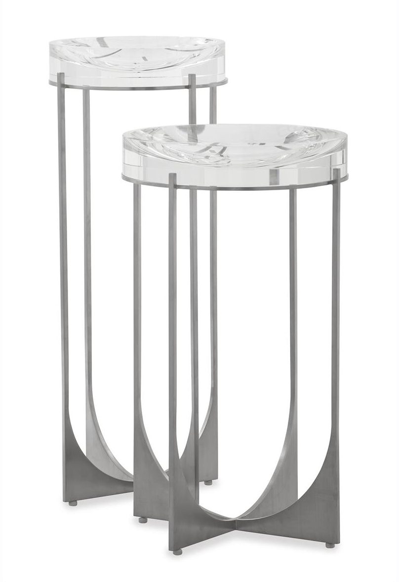 Product Description: John Richard JFD-0371 Svelte Martini Table II Silver - The Svelte Martini Table is an exquisite accent piece characterized by a lithe profile and striking interplay between slender lines and delicate curves. A stainless-steel frame is imbued with a brushed finish and supports a stunning, circular surface of clear crystal.