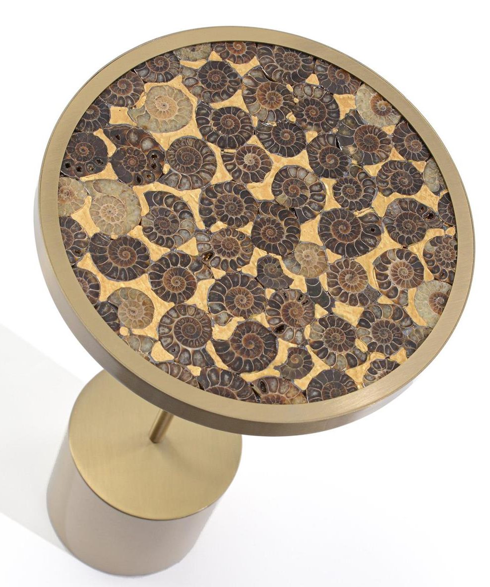 Product Description: John Richard JFD-0377 Donatello Martini Table - The Donatello is an innovative marriage of natural motifs and contemporary design. Crafted from metal in a bronzed finish, the table features a rounded cylindrical base. The tabletop features an assortment of intricate seashell patterns, creating a visually stunning juxtaposition between organic shapes and metallic tones.