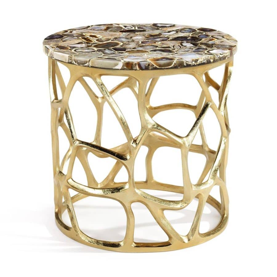 Product Description: John Richard JFD-0460 Renata Side Table - The Renata Side Table showcases a harmonious fusion of natural materials and contemporary design. A rounded agate tabletop in striking black and gray tones is supported by an organically shaped aluminum base in Brass. The unique design of the base showcases a tasteful use of negative space, contributing a wealth of visual interest.