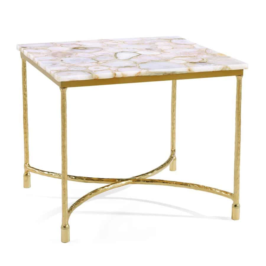 Product Description: John Richard JFD-0462 Nara Side Table - The Nara Side Table is a stylish statement piece that blends ornate tones with natural materials. Crafted from steel and aluminum in a Bronzed finish, its slender frame features a curved cross base that adds sculptural interest. A rectangular tabletop of natural white agate showcases beautiful banding patterns, bringing stunning organic motifs to any setting.