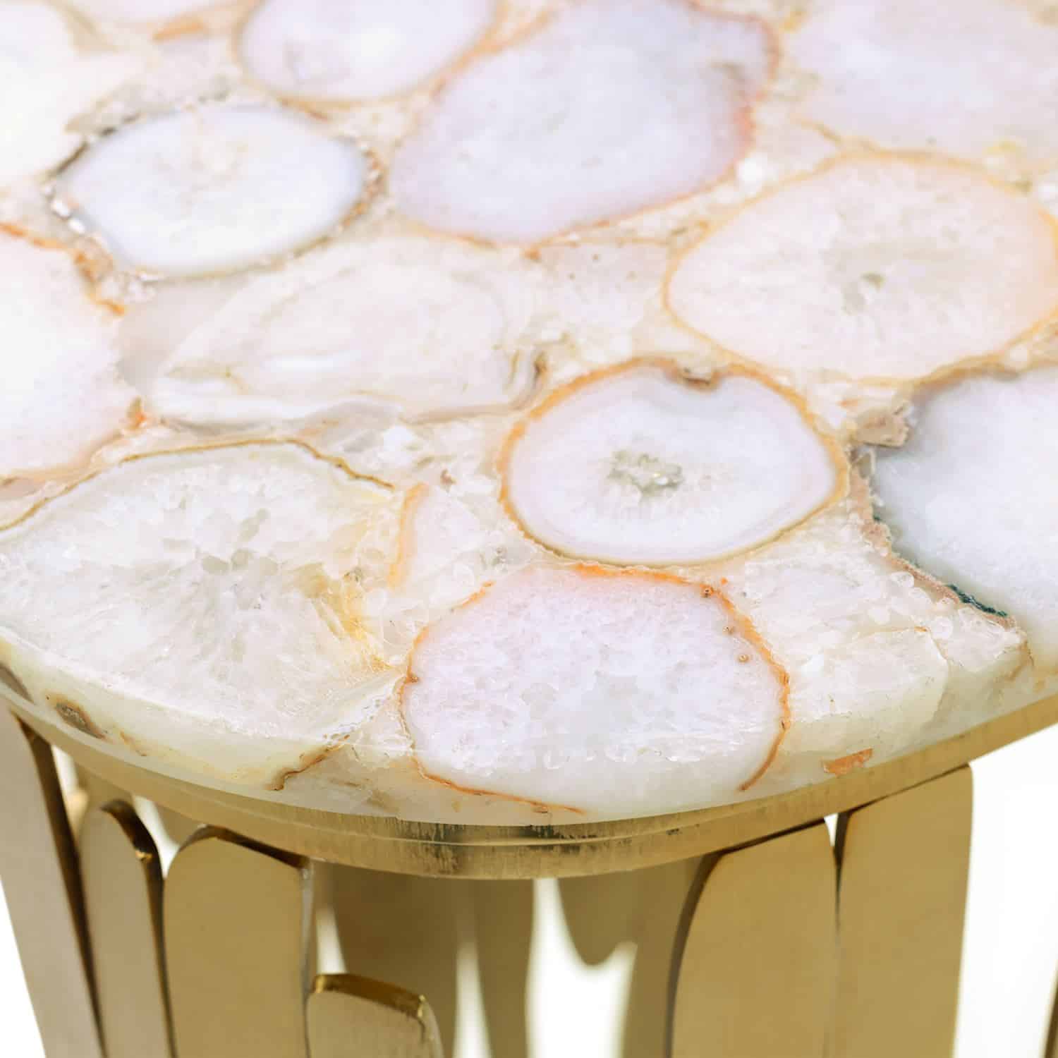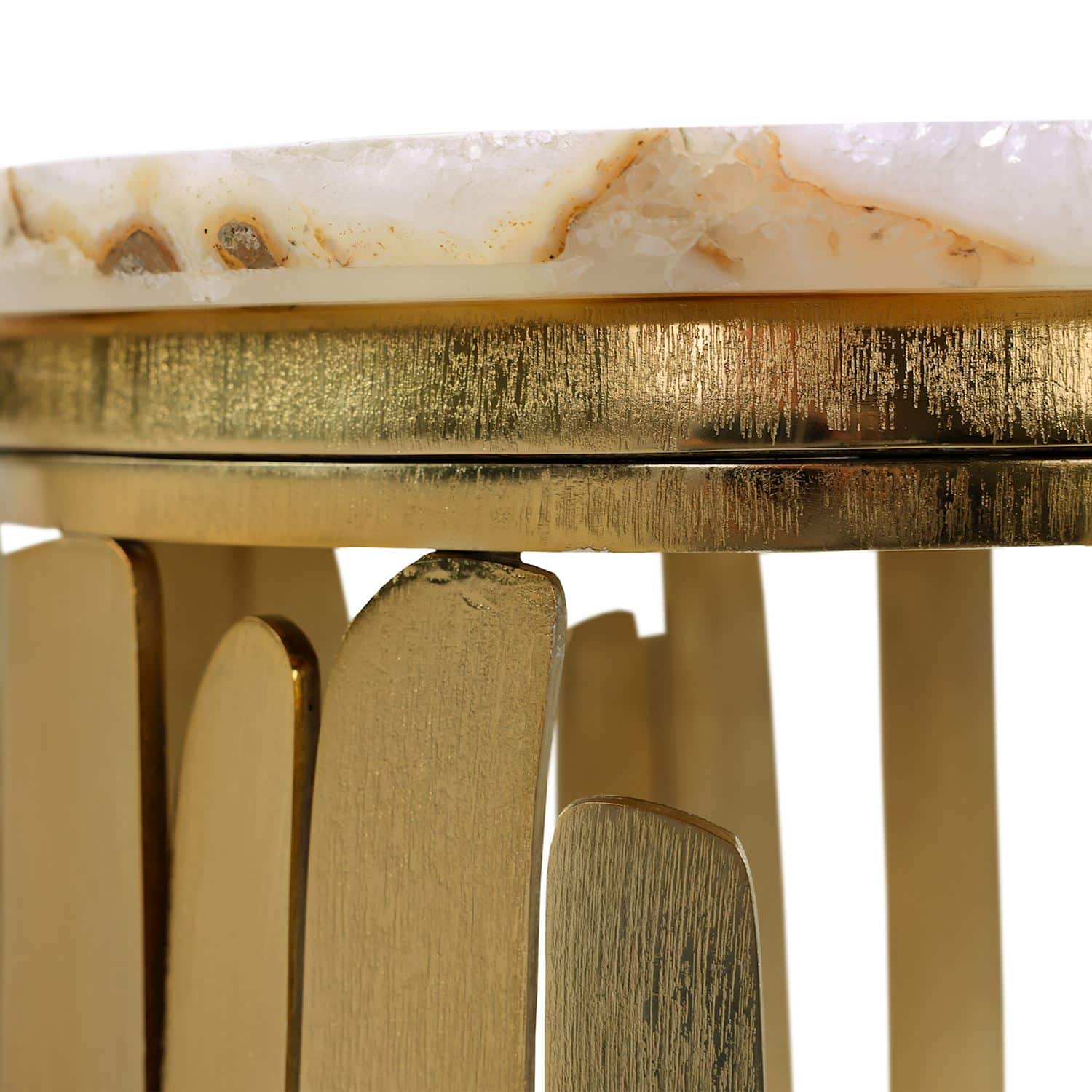 Product Description: John Richard JFD-0468 Manchette Console Table - The Manchette Cocktail Table brings bold flair to any room with its eye-catching design. The ovate white agate top showcases soft, natural banding, while the steel legs in a Bronzed finish take the shape of stylish cuff bracelets. Wispy, abstract patterns create pockets of negative space that add depth and visual interest, enhancing the piece’s dimensional elegance.