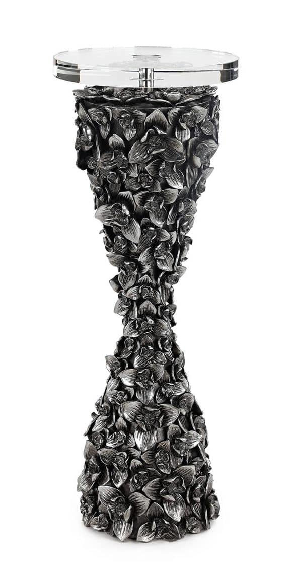 Product Description: John Richard JFD-0542 Mazzo Martini Table - The Mazzo Martini Table features an iron base adorned with ornate composite florals in Silver tones, accentuating the table’s elegant hourglass silhouette. A clear crystal tabletop completes the design, beautifully highlighting the metallic accents.