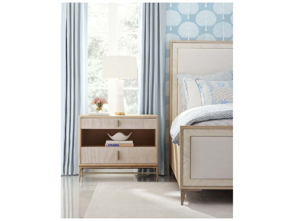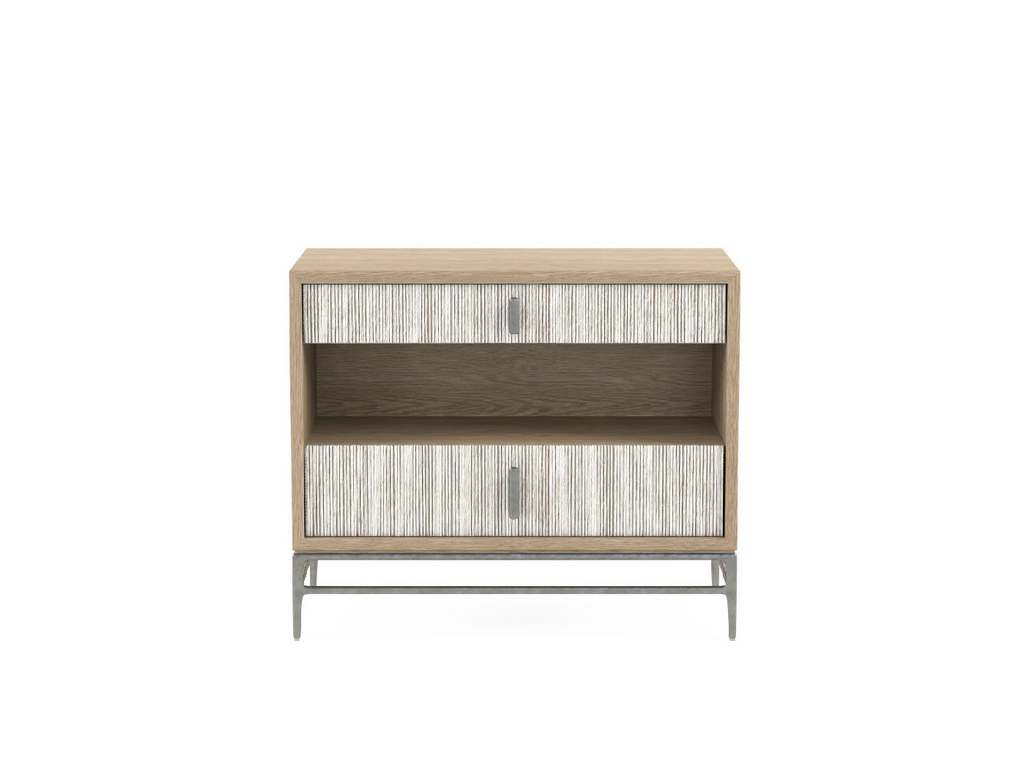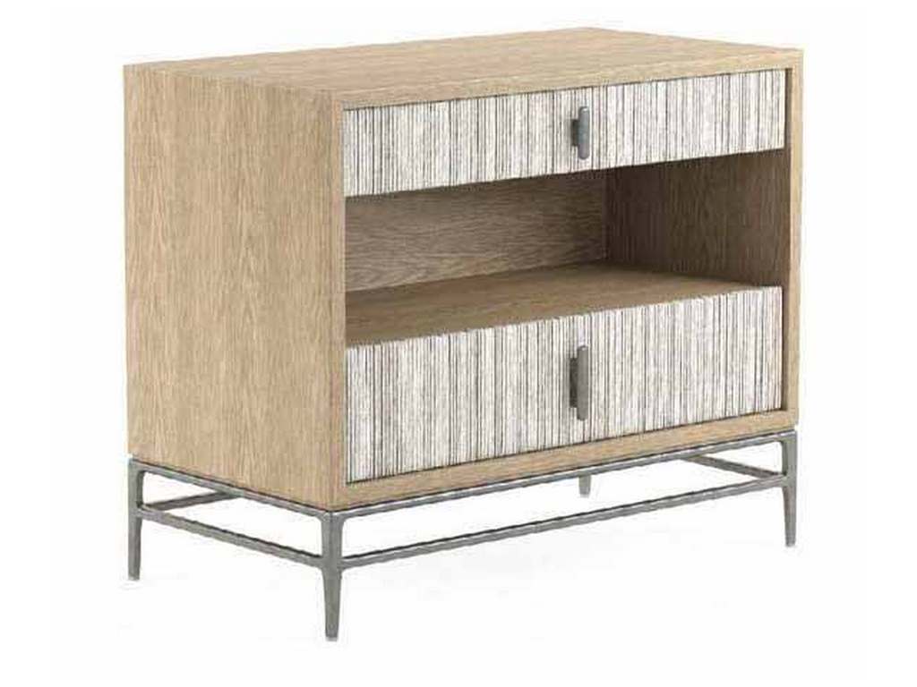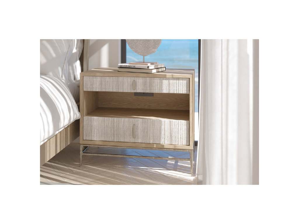 Product Description: Jonathan Charles 001-1-802-CRD Clapotis Danish Cord Nightstand - Featuring two drawers with Danish cord-wrapped fronts, this piece combines contemporary style with timeless craftsmanship. Its cast stainless steel base and hand cast vertical hardware, finished in satin white brass, create a refined, luxurious look that complements both elegant and eclectic interiors.