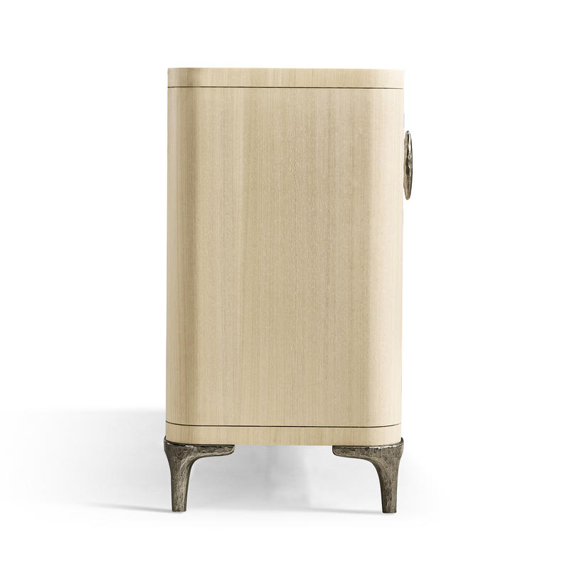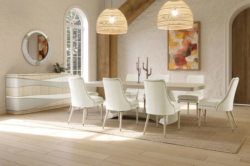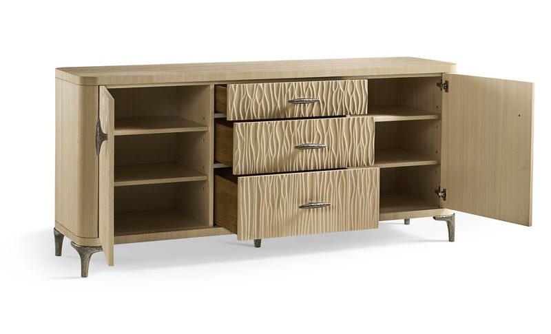 Collection Description: Rich with artful visual touches, the stirring Jonathan Charles Water Portfolio is flawlessly crafted and imbued with the luxurious textures of natural woven grasscloth, soft cream leathers, bone inlay and Koto veneers. This eclectic mix of materials, paired with sinuous and flowing architectural features reminiscent of waves, is a showcase of delightful dynamism with contrasting line and form. An exquisite appointment package of hand cast,custom hardware accentuates htis exceptional furniture portfolio.