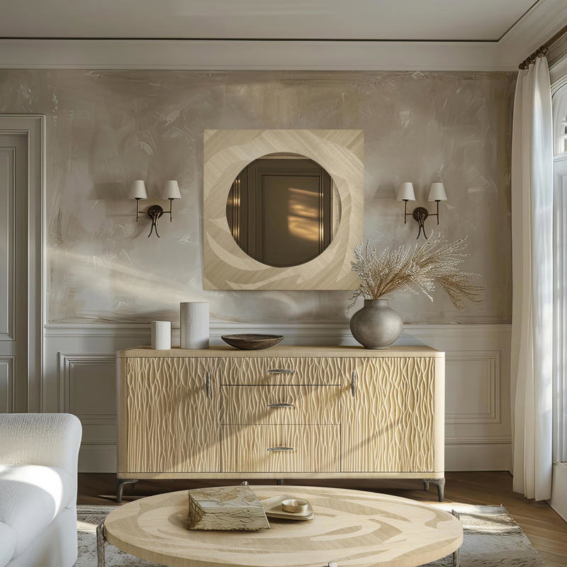 Rich with artful visual touches, the stirring Jonathan Charles Water Portfolio is flawlessly crafted and imbued with the luxurious textures of natural woven grasscloth, soft cream leathers, bone inlay and Koto veneers. This eclectic mix of materials, paired with sinuous and flowing architectural features reminiscent of waves, is a showcase of delightful dynamism with contrasting line and form. An exquisite appointment package of hand cast,custom hardware accentuates htis exceptional furniture portfolio.