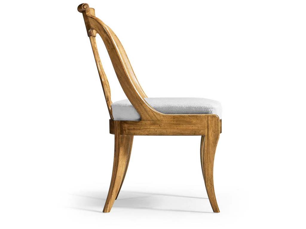 Product Description: Jonathan Charles 007-2-125-NCJ Vermeer Dining Chair - Meticulously crafted, the Vermeer Dining Chair showcases a gracefully curved splat back, expertly designed to provide both aesthetic appeal and comfort. The true focal point lies in the Cerejara veneers, which elegantly swirl down the splat back, adding a captivating touch of natural beauty to the chair's design. An upholstered seat covered in an neutral performance fabric rounds out this chairs comfort and sustainability when entertaining with family and friends.