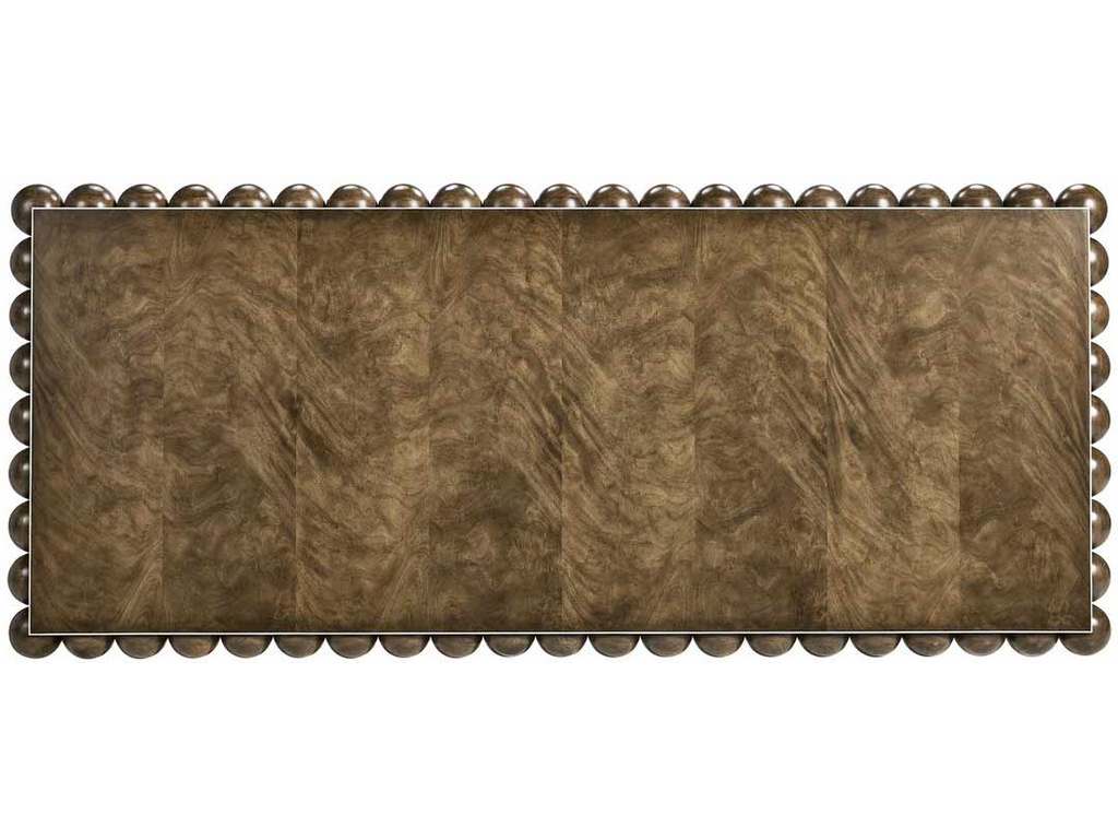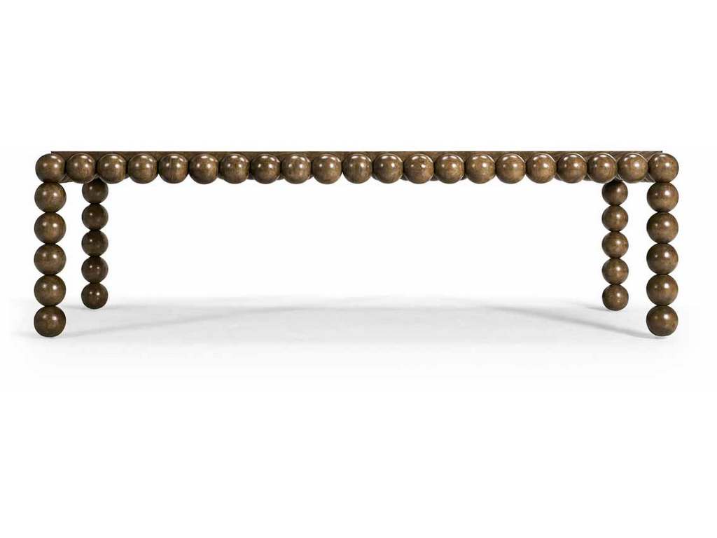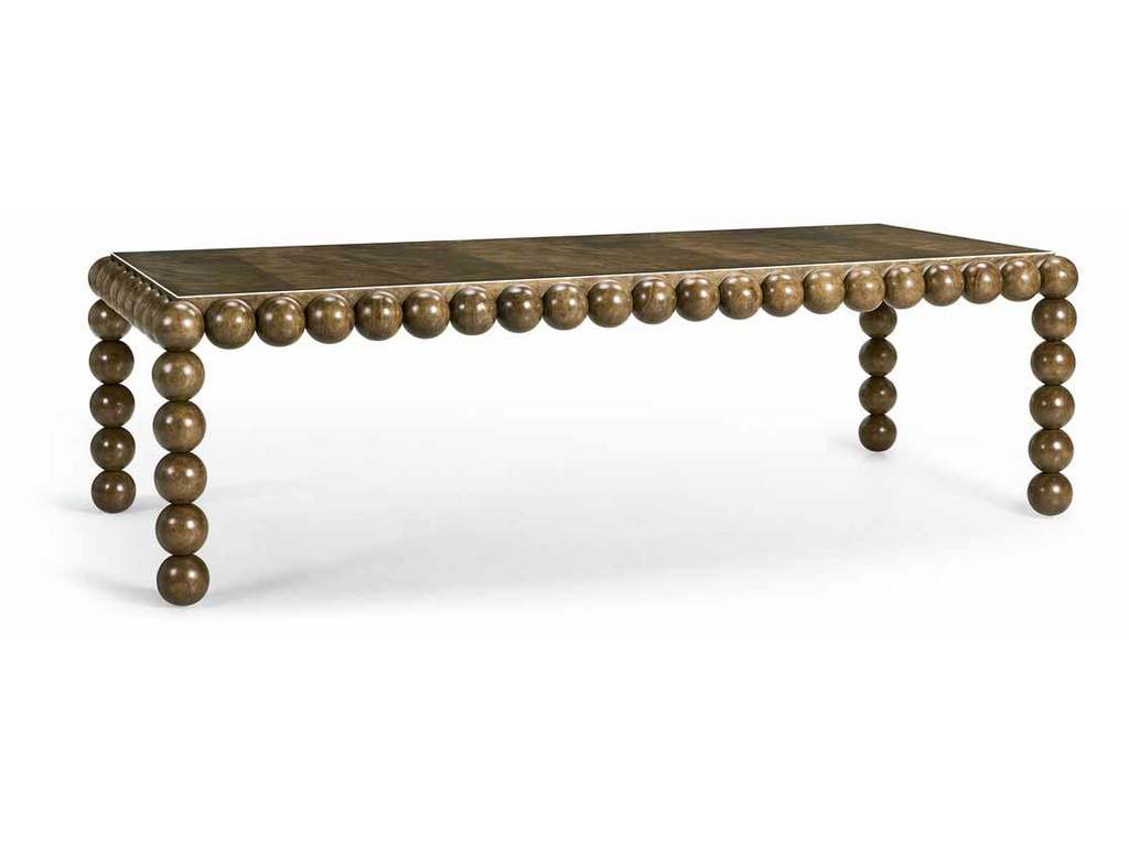 Product Description: Jonathan Charles 007-2-A60-MBM Orb Rectangular Dining Table 103 Inch - Its solid wood stacked spheres form a striking base, blending art and functionality, while the faux bone inlay contrasts subtly with medium brown mahogany veneers. With its unique leg and apron design, this table adds personality and sophistication, turning every meal into a stylish experience.