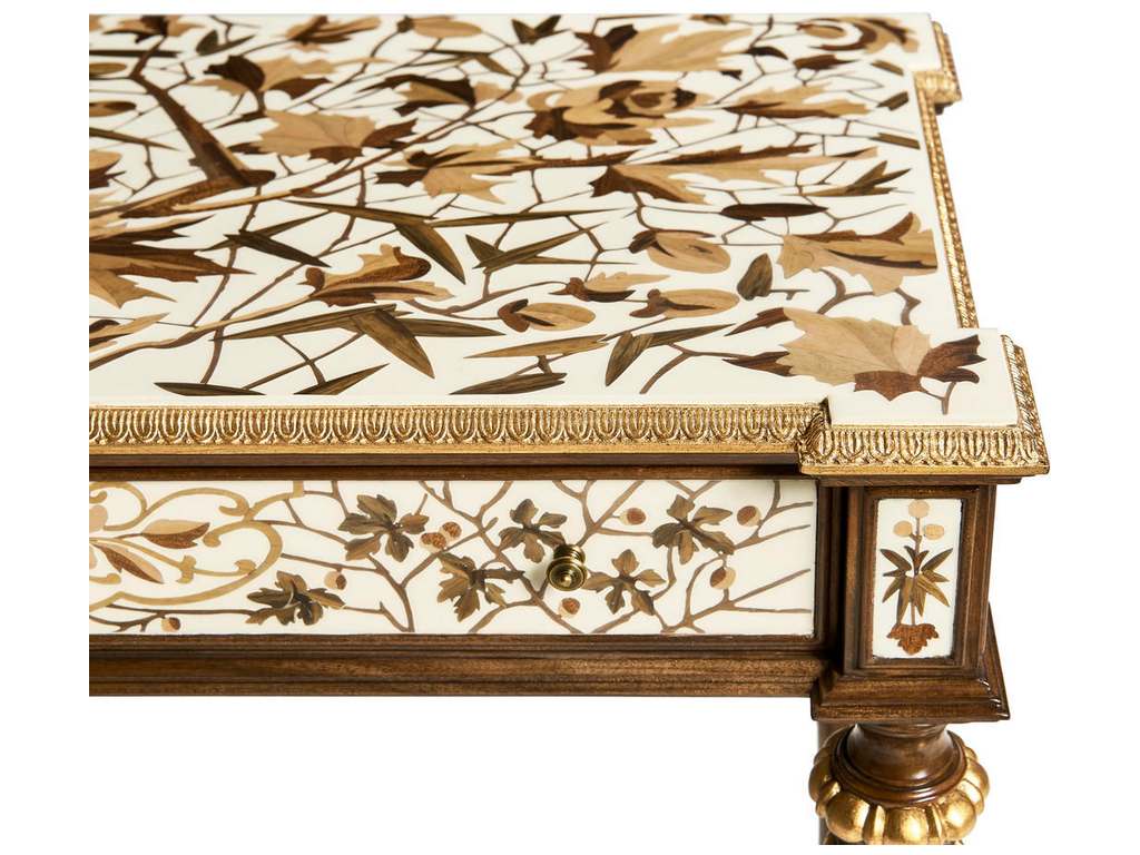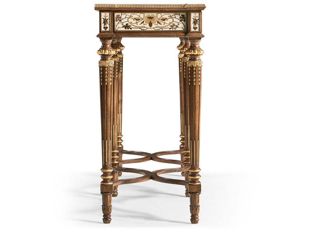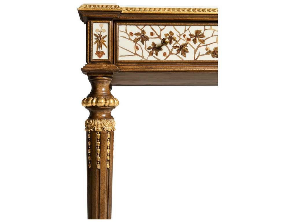 Product Description: Jonathan Charles 007-3-AT0-OLP Trianon Console Table - Featuring a case decorated with hand-applied maple leaf and acorn marquetry that celebrates natural beauty. The intricate design is enhanced by the Scagliola technique, where the veneer is filled with white lacquer for a striking visual effect. Gold leaf appliques add a touch of luxury, making this table a standout piece in any room.