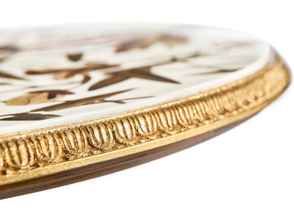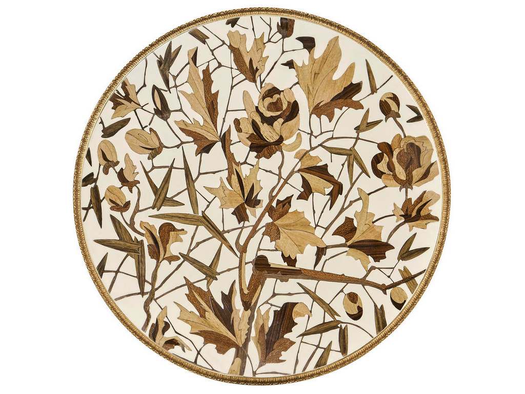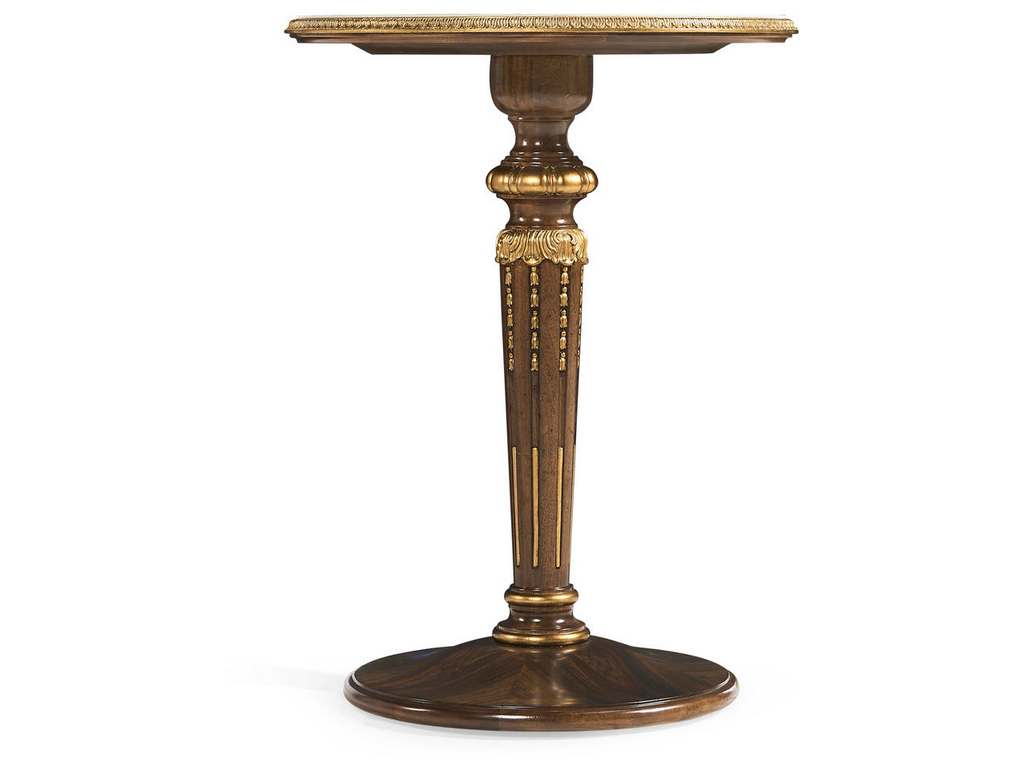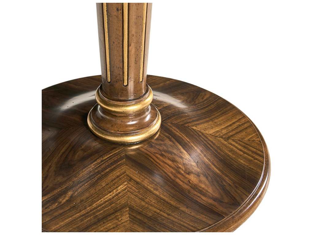 Product Description: Jonathan Charles 007-3-DQ0-OLP Trianon Accent Table - Made from mahogany and marquetry veneers, its tabletop features a striking maple leaf and acorn pattern, enhanced by gold leaf accents. With petite brass hardware and hand-carved turned legs, this elegant table adds timeless style and versatility to any space.