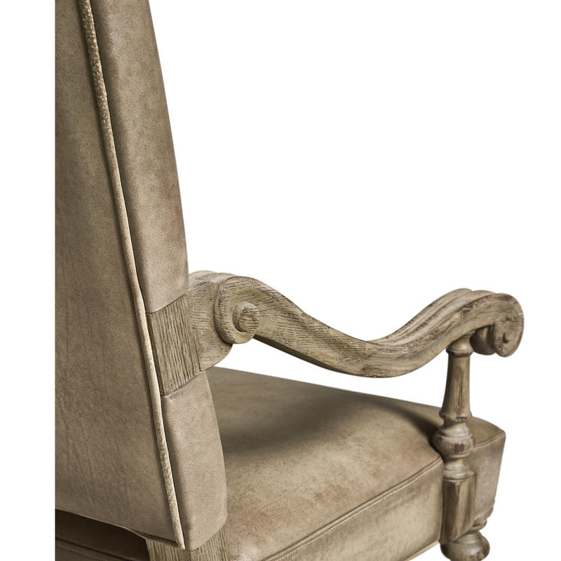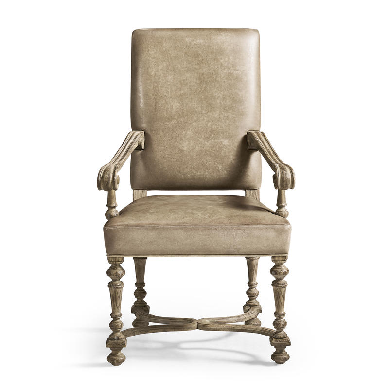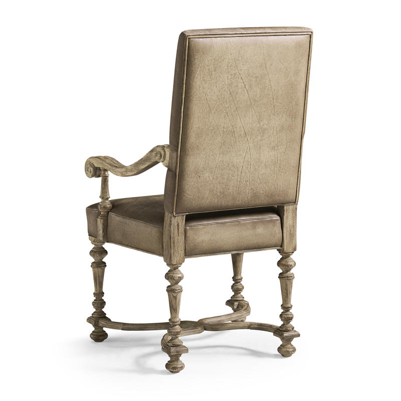 Product Description: Jonathan Charles 491234-TGO-AC-U1 Sagehill Leather Arm Chair - The Sagehill Leather Arm Chair seamlessly combines casual charm with a refined elegant style. Its beautifully turned legs and scrolled arms are finished in a weathered grey oak, offering a touch of traditional elegance while enhancing the chair's casual appeal. The seat and back are upholstered in hand-stained, sandy-colored leather, providing a comfortable seat that compliments the natural wood tones. Perfect for everyday dining, this chair will offer style and comfort for years to come.