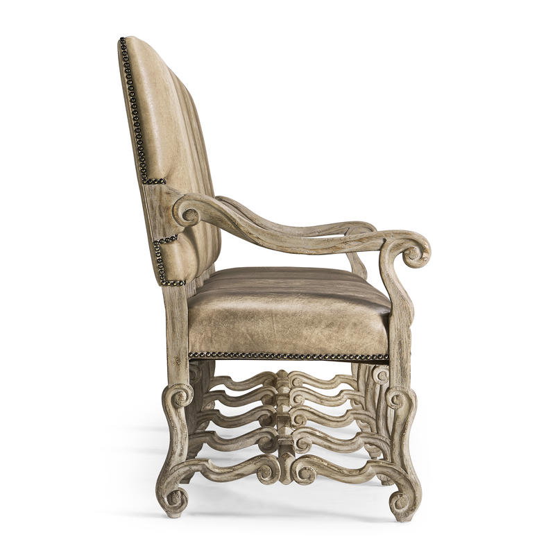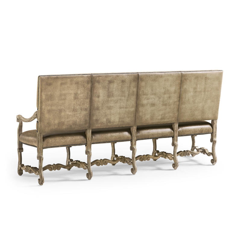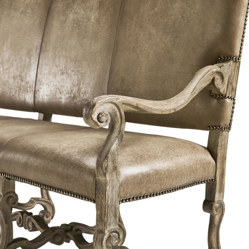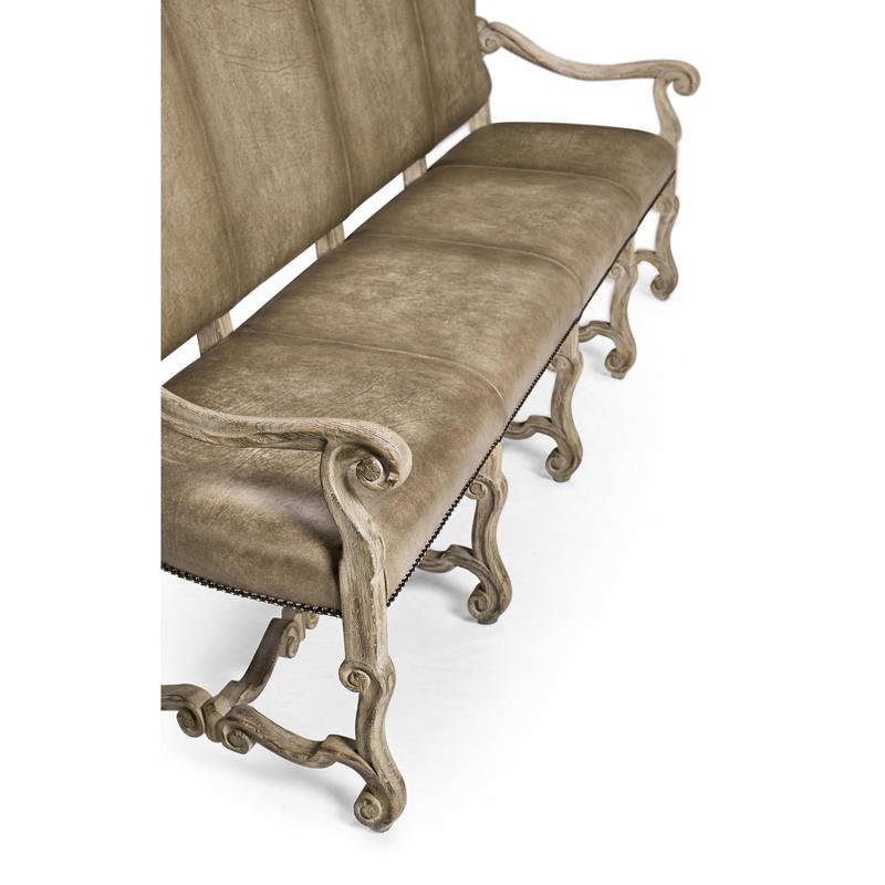 Product Description: Jonathan Charles 491235-TGO-U1 Sagehill Leather Banquette Bench - The Sagehill Leather Banquette Bench is a stunning blend of artistry and rustic elegance. Designed to seat four comfortably, this bench features a striking base adorned with intricate scroll details, making it a true piece of carved art. Finished in a weathered grey oak, the base complements the warm, sandy-colored leather upholstery, adding a sophisticated yet inviting touch to any space. Whether placed in a dining area or as a statement piece in a hallway, this banquette bench brings both beauty and functionality to your home.