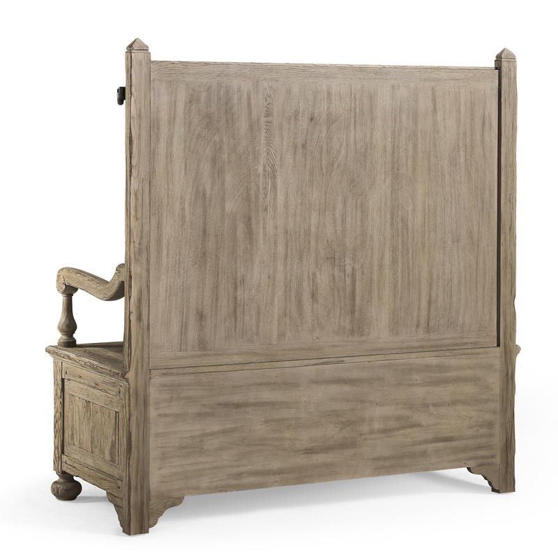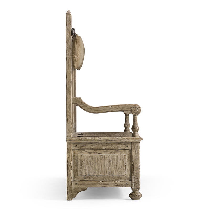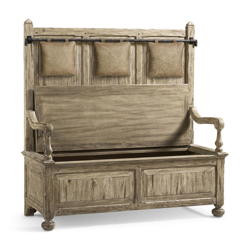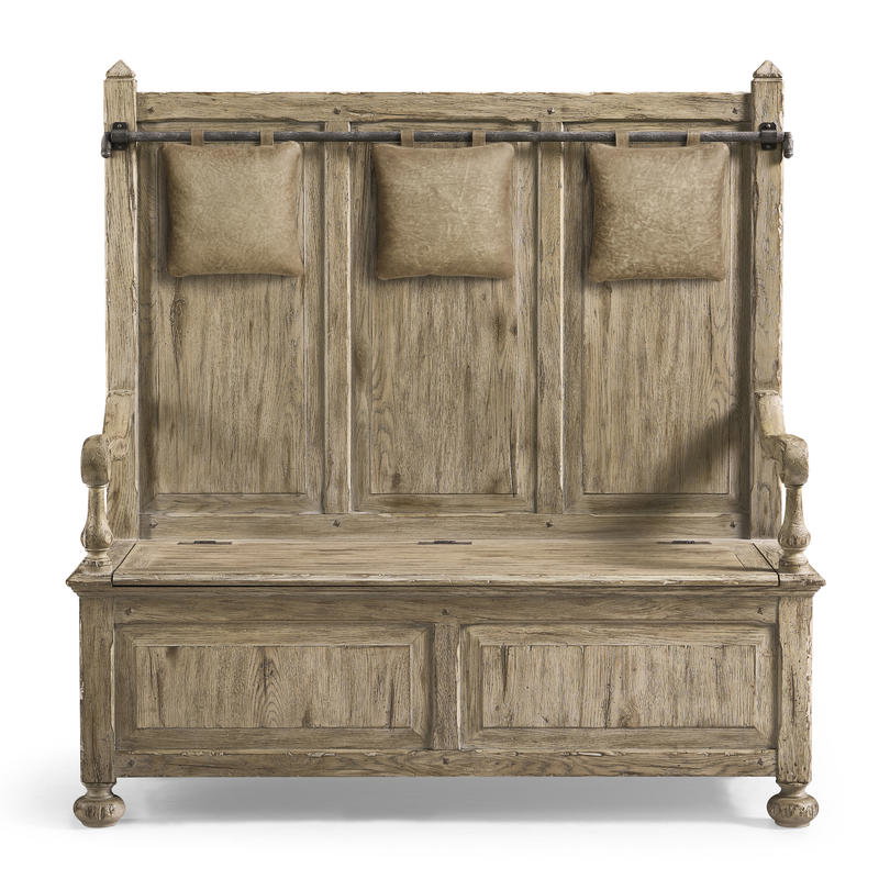 Product Description: Jonathan Charles 491253-TGO Sagehill Hall Bench - The Sagehill Hall Bench combines practicality with a touch of rustic elegance. Crafted from solid wood and finished in a rich weathered oak, this bench offers both style and functionality. The seat opens up to reveal convenient storage, perfect for keeping entryway essentials organized. For added comfort, the bench comes with three hand-stained leather pillows, providing a luxurious touch to the seating experience.