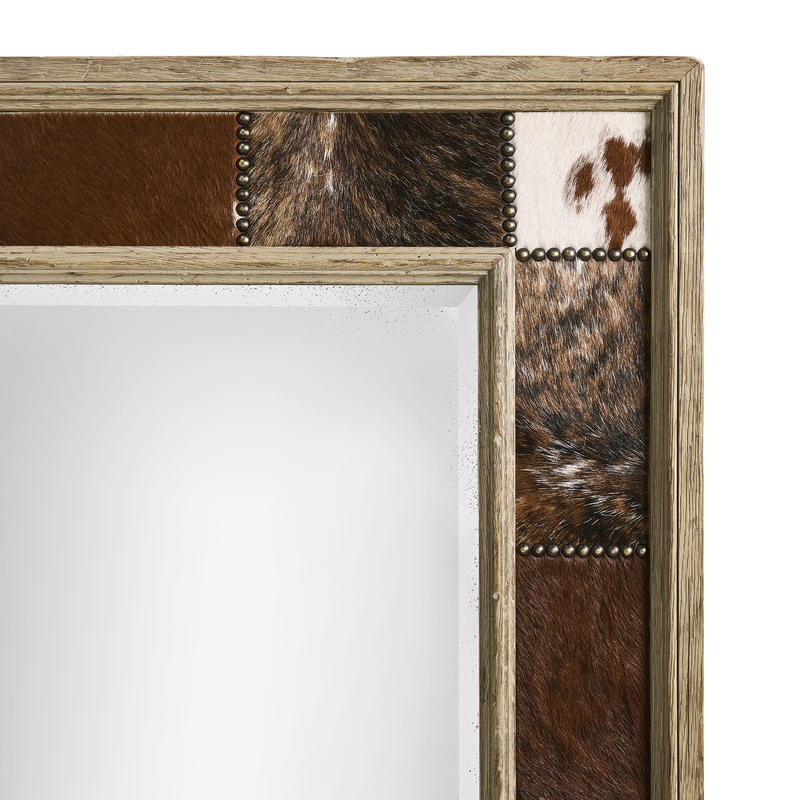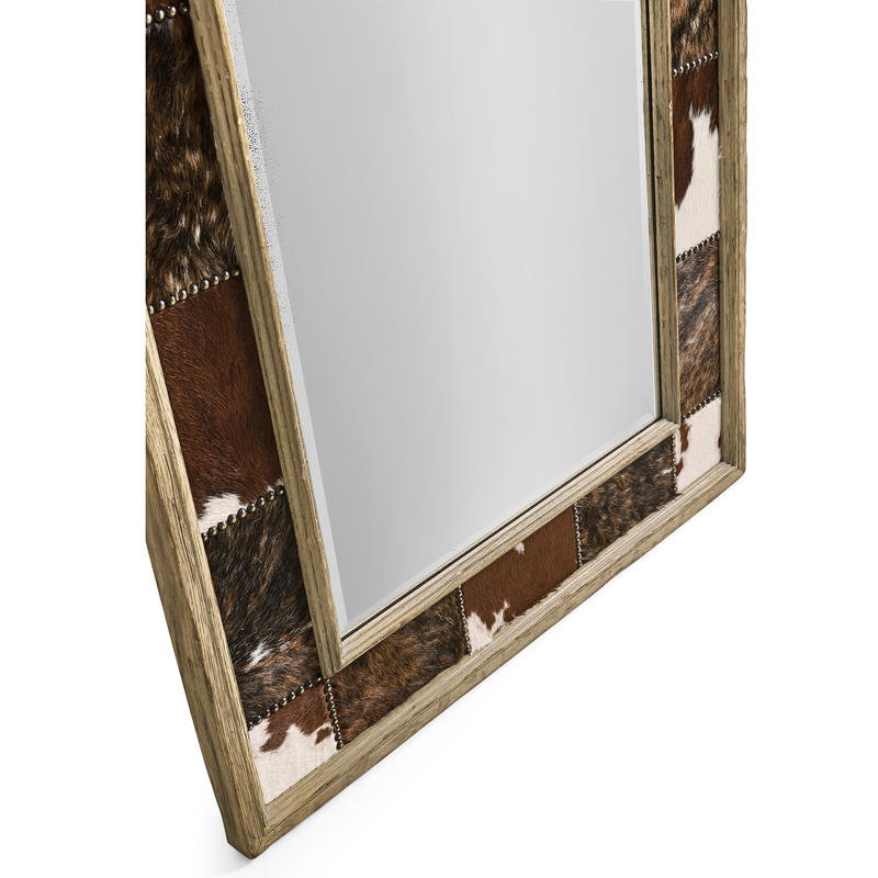 Product Description: Jonathan Charles 491255-TGO Sagehill Rectangular Hide Mirror - The Sagehill Rectangular Mirror stands out with its unique cowhide upholstery, adding a natural, textured element that instantly draws attention. Framed in beautifully weathered oak, this mirror exudes a natural allure, making it a perfect fit for homes with a countryside-inspired or earthy aesthetic.