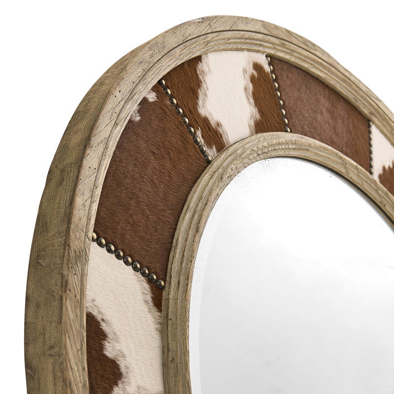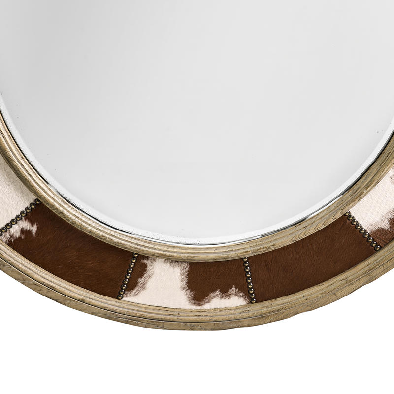 Product Description: Jonathan Charles 491264-TGO Sagehill Round Hide Mirror - The Sagehill Round Mirror stands out with its unique cowhide upholstery, adding a natural, textured element that instantly draws attention. Framed in beautifully weathered oak, this mirror exudes a natural allure, making it a perfect fit for homes with a countryside-inspired or earthy aesthetic.