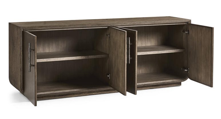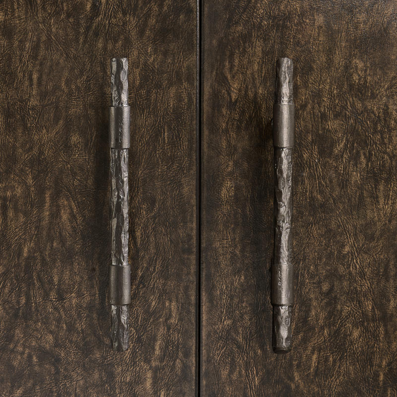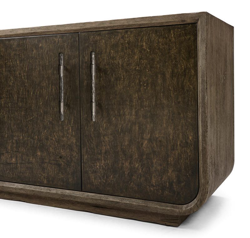 Product Description: Jonathan Charles 491279-TDA Stone Ridge Leather Credenza Dark - The Stone Ridge Leather Credenza is a stunning blend of modern design and organic materials, making it the perfect statement piece for your home. Finished in Tully Dark Acacia, this credenza showcases four sleek doors adorned with elegant dark brown toned leather fronts, offering a unique contrast that adds warmth and texture to the overall design. Behind the doors, adjustable shelves provide flexible storage options, making it as practical as it is beautiful. The modern silhouette, combined with natural materials, gives this piece versatility—whether you're complementing a rustic-inspired home or adding a touch of nature to a contemporary setting.