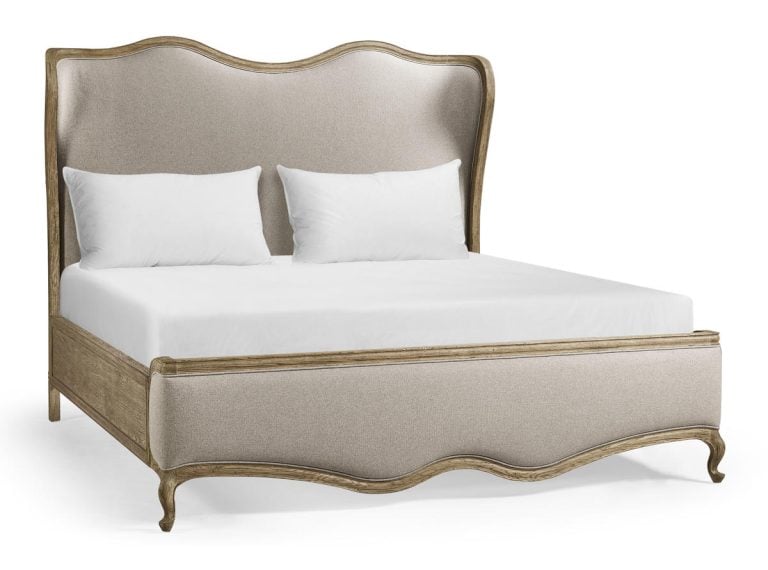 Product Description: Jonathan Charles 491287-FDO-C-F062 Echo Canyon Upholstered Cal King Bed - The Echo Canyon Bed is a beautifully crafted transitional piece that seamlessly blends classic elegance with modern comfort. Framed in oak with a rich faded oak finish, this bed showcases the artistry of antique wood finishing, enhancing its warmth and character. The sculpted silhouette of the headboard and footboard adds a graceful, refined touch, while the softly upholstered panels provide a layer of luxurious comfort. Delicate curves and cabriole-style legs further elevate its timeless appeal. Perfect for both traditional and contemporary interiors, the Echo Canyon Bed creates a serene and sophisticated focal point in any bedroom.