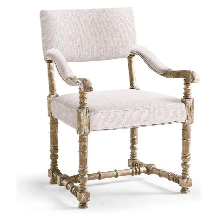 Product Description: Jonathan Charles 491293-LSW-AC-F075 Caldera Uph. Arm Chair - The Caldera Fabric Arm Chair embodies timeless sophistication with its Spanish style silhouette and expert craftsmanship. Finished in Painted Spanish Walnut, a warm greyed oak tone that exudes subtle rustic charm, it brings depth and character through delicately applied painted accents that highlight the natural grain. Elegantly turned legs and a gracefully contoured back accentuate the refined form, harmonizing beautifully with the soft, richly textured fabric upholstery. Whether placed around a dining table or used as an accent seat, the Caldera Fabric Side Chair offers an inviting balance of heritage design and contemporary luxury.