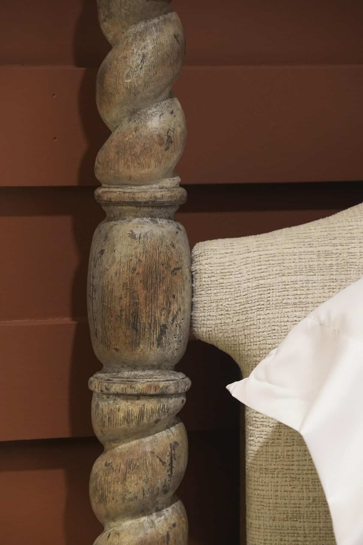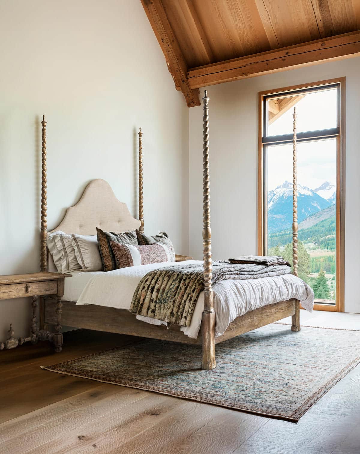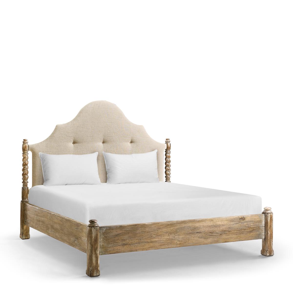 Product Description: Jonathan Charles 491294-LSW-K-F400 Caldera Poster King Bed - The Caldera Poster Bed blends timeless Spanish influence with refined craftsmanship. Built from acacia in a Light Spain Painted Walnut finish, this bed features tall, turned posts that frame a gracefully arched, upholstered headboard. Painted accents enrich the wood's natural grain, while the hand-applied finish adds rustic warmth. For added versatility, the bed includes removable posts that can be capped for a more streamlined look. With its dramatic silhouette and tailored upholstery, the Caldera Poster Bed brings heirloom style and modern comfort into perfect balance.