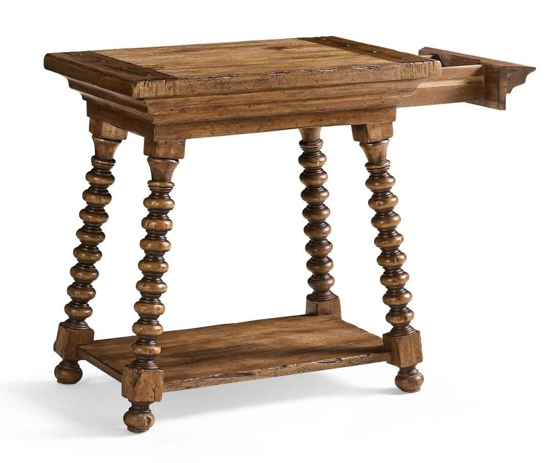 Product Description: Jonathan Charles 491302-MSW Tamarisk Storage End Table - The Tamarisk End Table blends old-world charm with everyday practicality. Intricately turned, spool-style legs lend a graceful sense of movement, while a warm, rustic finish highlights the natural wood grain. A raised tabletop and lower shelf provide ample space for displaying décor or keeping essentials close at hand. Tucked discreetly beneath the tabletop, a hidden soft-close drawer offers convenient storage for small items—ensuring they remain out of sight yet within easy reach. Perfect as a companion piece to a sofa or as a stand-alone accent, the Tamarisk End Table is a timeless addition to any living space.