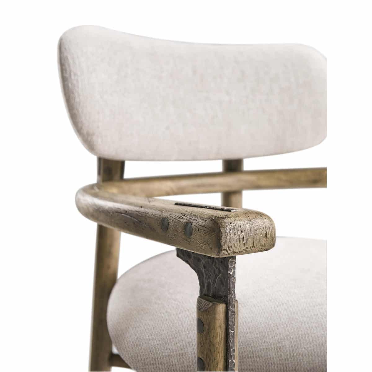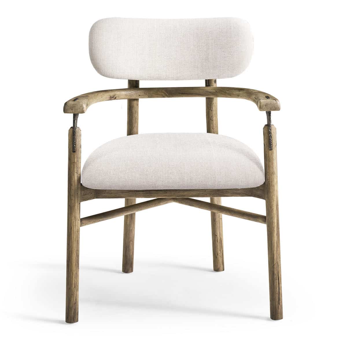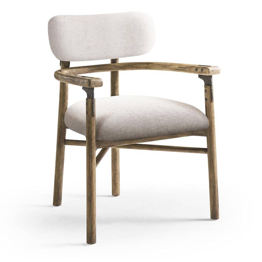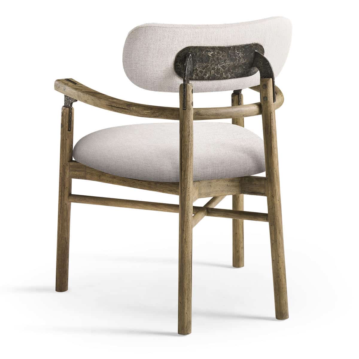 Product Description: Jonathan Charles 491320-TLA-AC-F075 Stone Ridge Upholstered Dining Arm Chair - The Stone Ridge Modern Arm Chair brings a sculptural sensibility to casual and formal spaces alike. Crafted from solid acacia in a light Tully finish, its clean-lined silhouette is softened by a gently curved backrest and sloped arms. Textural stainless-steel brackets lend a contemporary industrial touch while upholstered cushions in a soft, neutral fabric offer supportive comfort. This versatile arm chair effortlessly balances modern design and natural materials for an elevated seating experience.