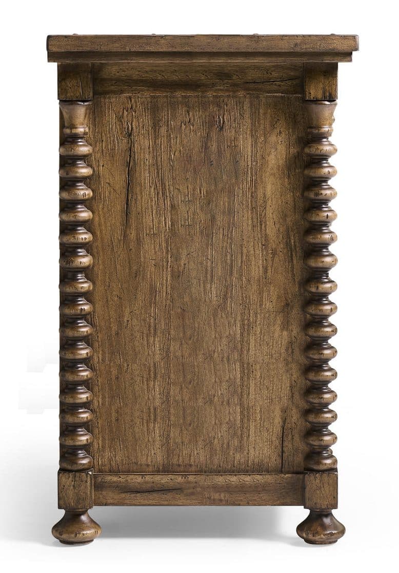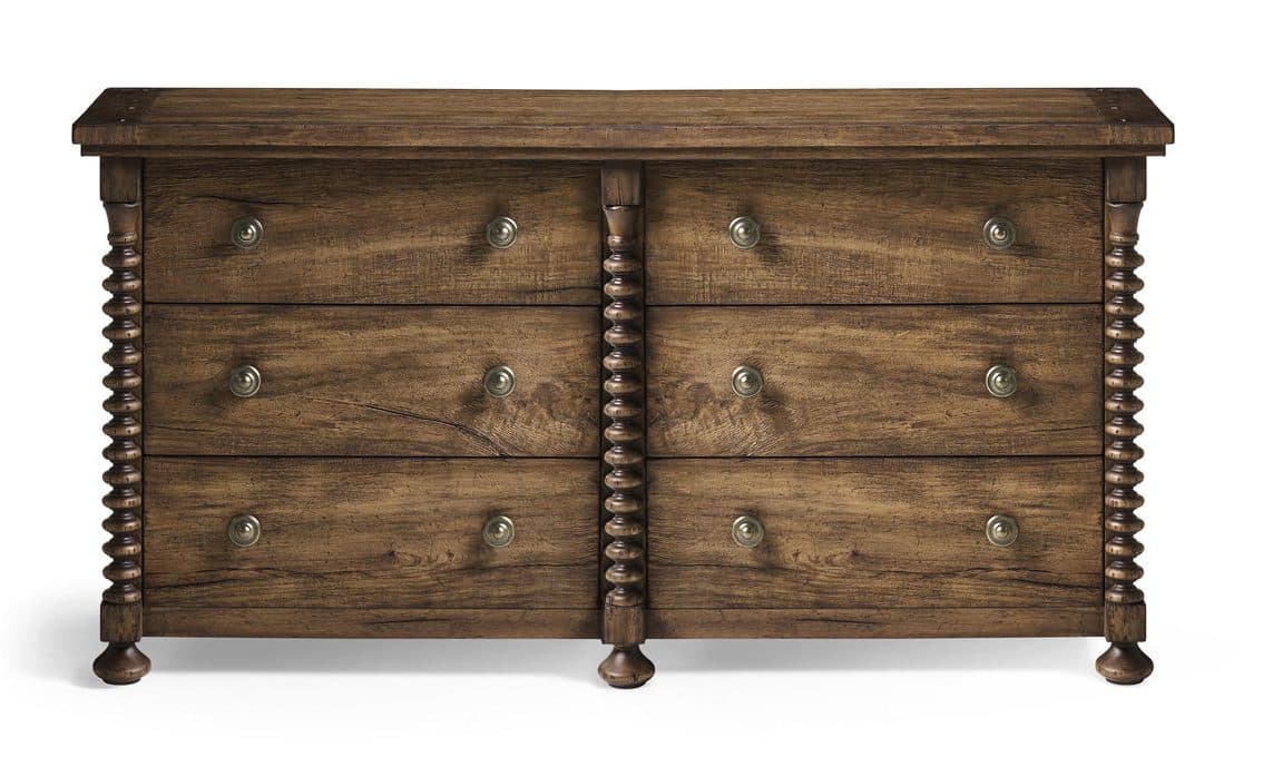 Product Description: Jonathan Charles 491323-MSW Tamarisk Dresser - The Tamarisk Dresser draws on heritage craftsmanship and bold materiality to deliver timeless character and everyday practicality. Crafted from richly grained acacia and finished in warm Medium Spain Walnut, this piece features sculptural spool-style corner posts and framed drawer fronts for added dimension. Nine spacious drawers provide generous storage, while antique brass drop pulls lend an elegant accent. A hand-applied finish and carved ball feet complete the design, balancing rustic texture with refined structure.