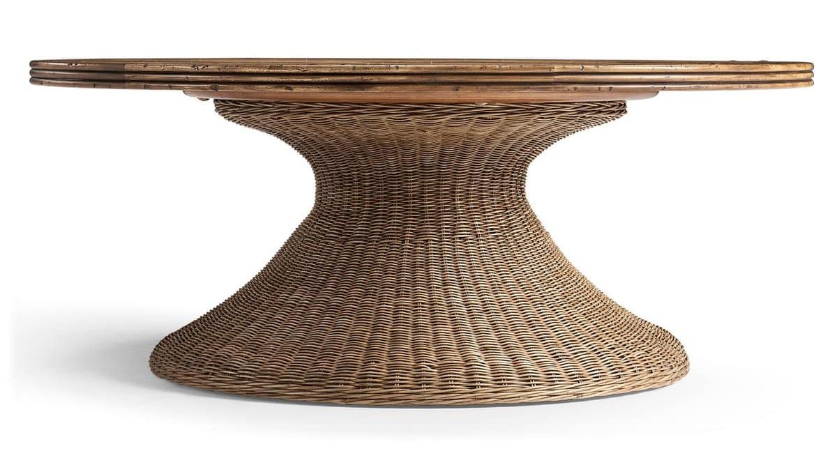 Product Description: Jonathan Charles 491331-C012 Palm Court Rattan Coffee Table - The Palm Court Rattan Coffee Table embodies British Colonial refinement through its elegant balance of form and material. A circular wood top rests on a handwoven rattan base that flares gracefully to the floor. Rich texture and a sculptural profile evoke timeless craftsmanship, while rounded edge detailing enhances soft sophistication.